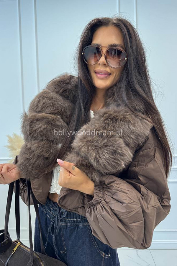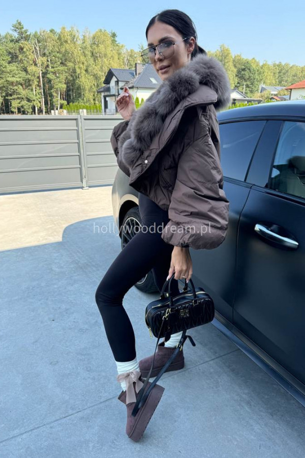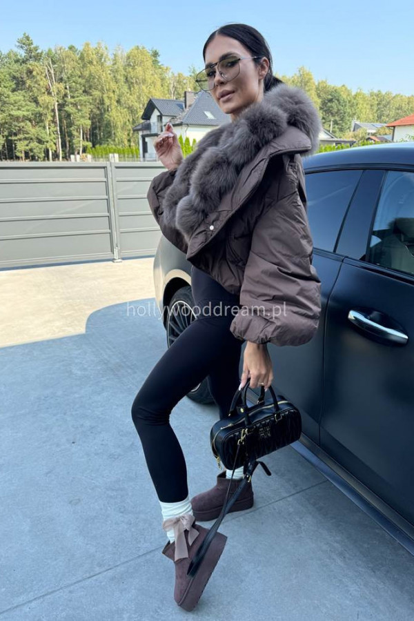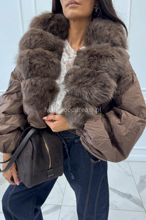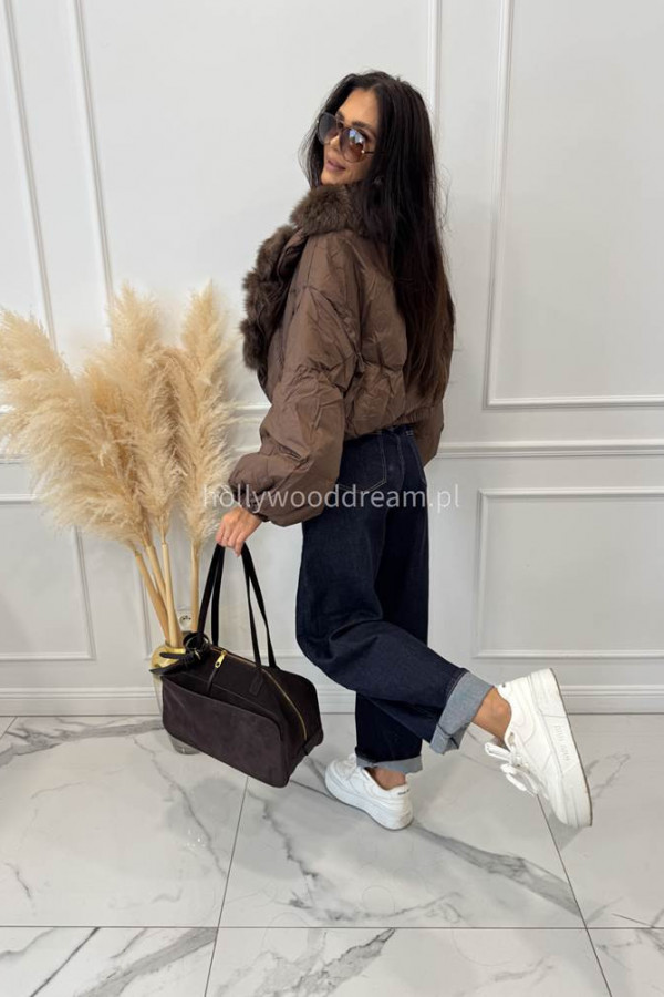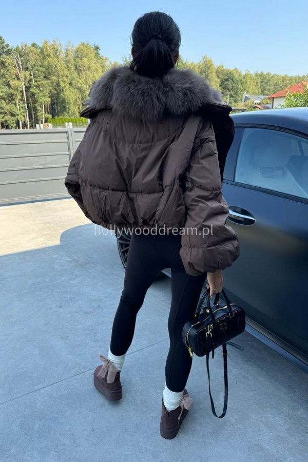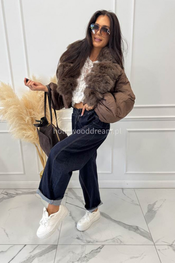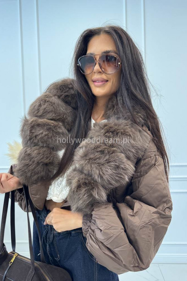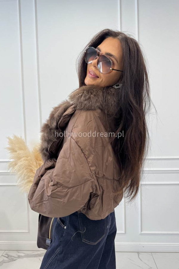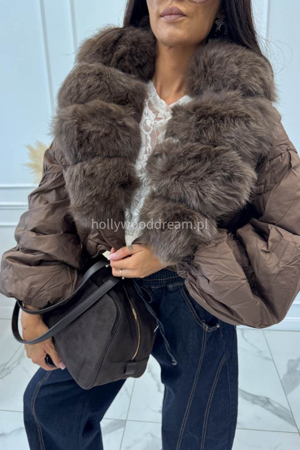 Kurtka krótka puchowa z odpinanym futrem czekoladowa z czekoladowym futrem TOMMY 37