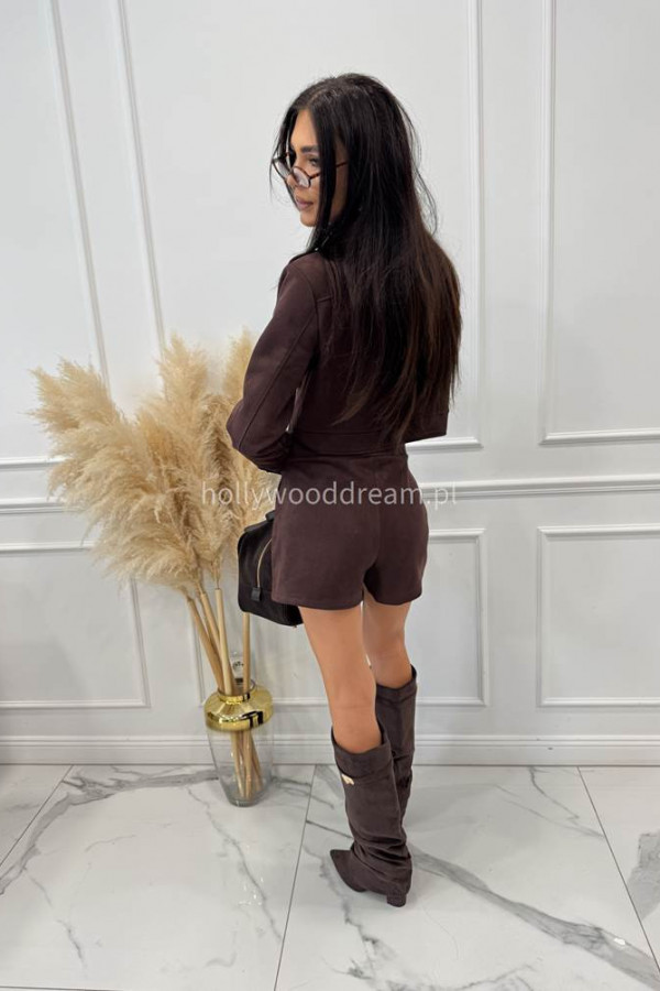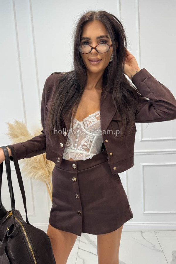 Komplet zamszowy EMILIA w kolorze czekoladowym to stylowa propozycja, która łączy elegancję z nutą swobody. Zestaw składa się z klasycznej marynarki-kurtki o prostym krótkim kroju oraz dopasowanych spodenek ze złotymi guzikami. Wykonany z miękkiego i przyjemnego w dotyku zamszu, zapewnia wygodę noszenia, a jednocześnie dodaje szyku każdej stylizacji. Marynarka z długim rękawem ma minimalistyczny fason idealny do stworzenia eleganckiego, a zarazem casualowego looku. Spodenki posiadają na przodzie zakładkę imitującą spódnicę, co podkreśla komfort użytkowania i idealnie dopasowuje się do sylwetki. Komplet doskonale sprawdzi się zarówno na co dzień, jak i na wieczorne wyjścia, gwarantując nowoczesny, stylowy wygląd.