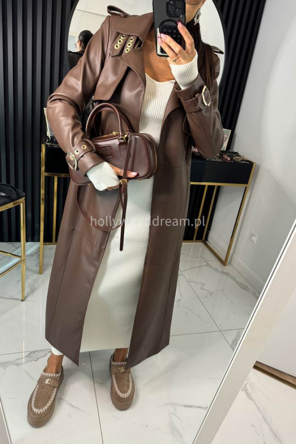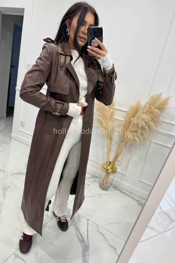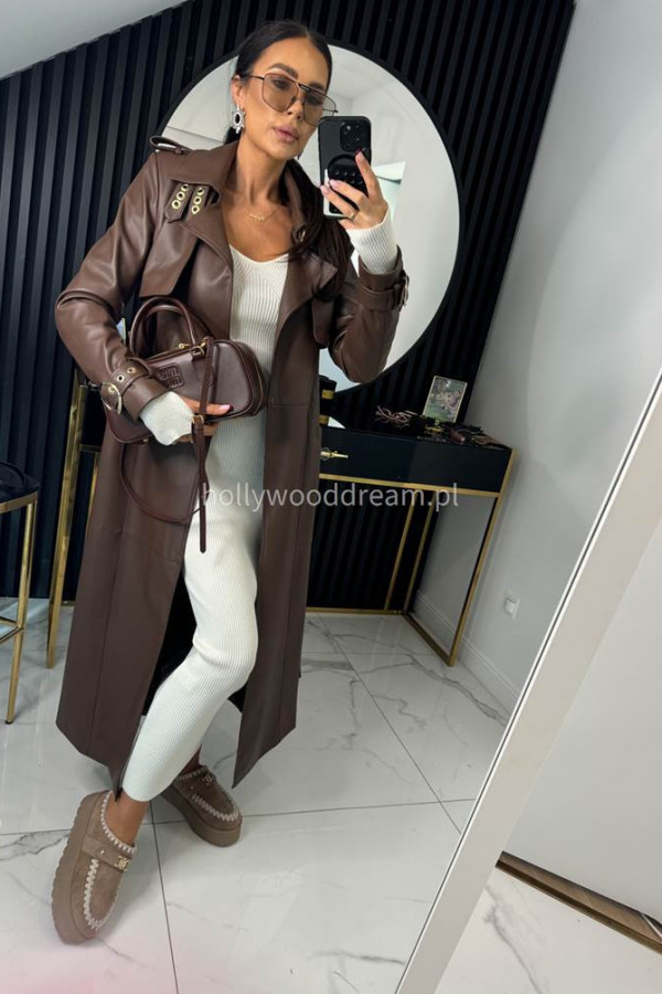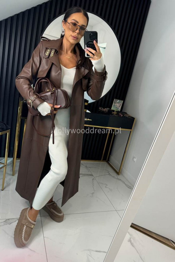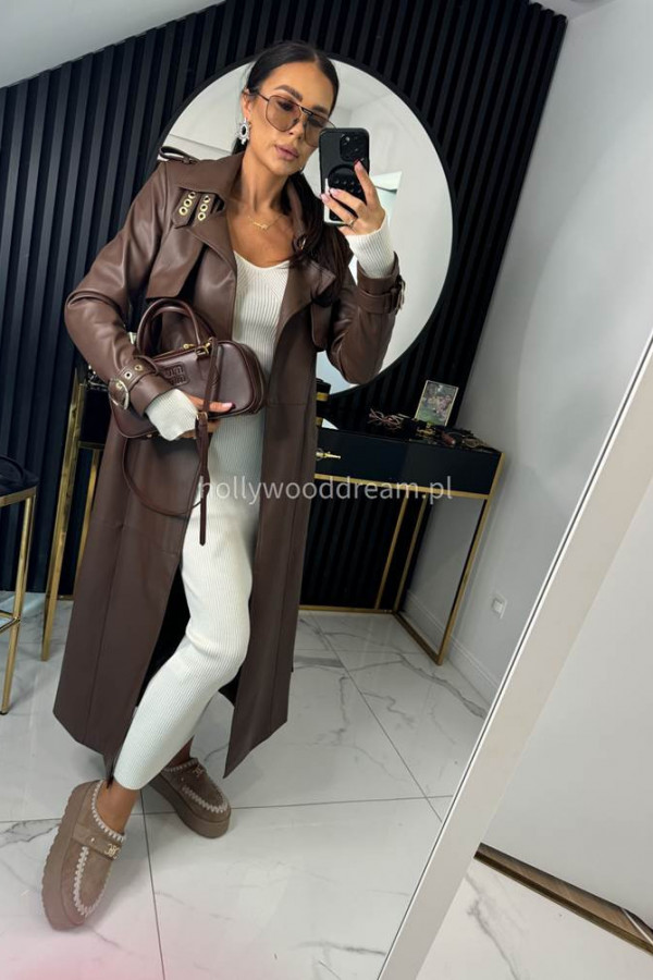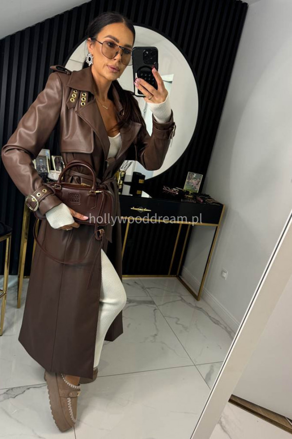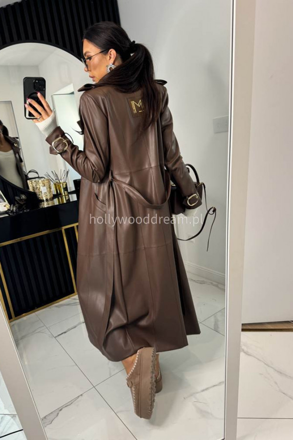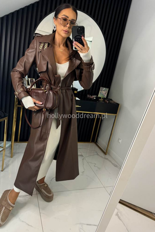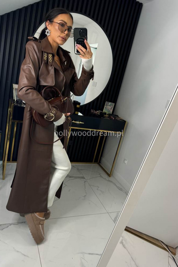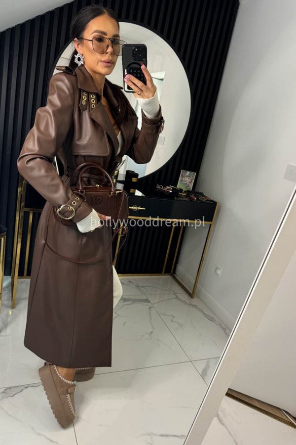Płaszcz skórzany MONA w kolorze czekoladowym to luksusowy element garderoby, który łączy klasyczny styl z nowoczesnym wykończeniem. Wykonany z wysokiej jakości imitacji skóry , zapewnia elegancki wygląd i trwałość na długie lata. Jego głęboki burgundowy odcień nadaje mu wyjątkowego charakteru, doskonale wpisując się w aktualne trendy modowe. Zapewnij sobie ciepło i styl tej zimy z Hollywood Dream! Model dostępny jest w rozmiarach S-L.