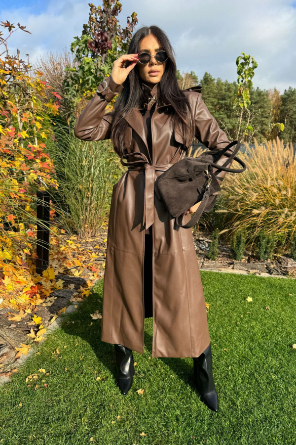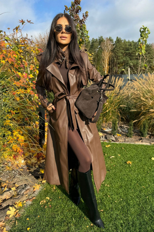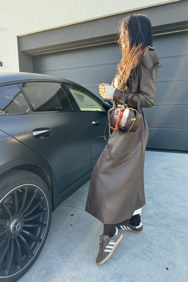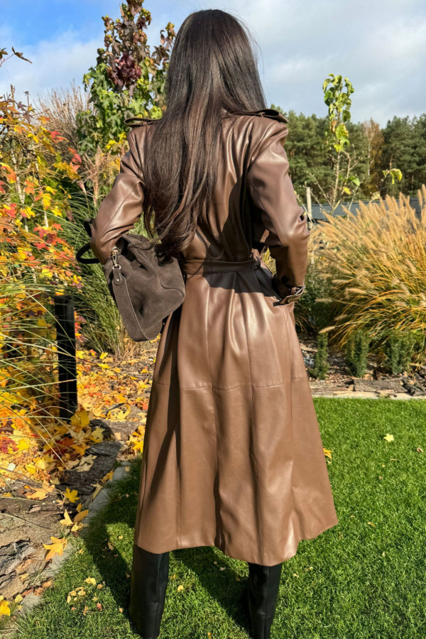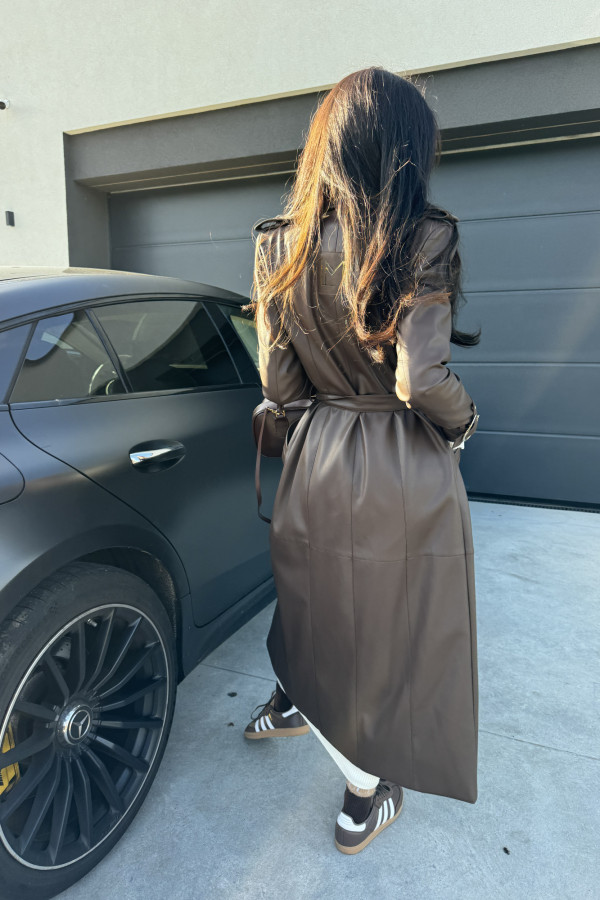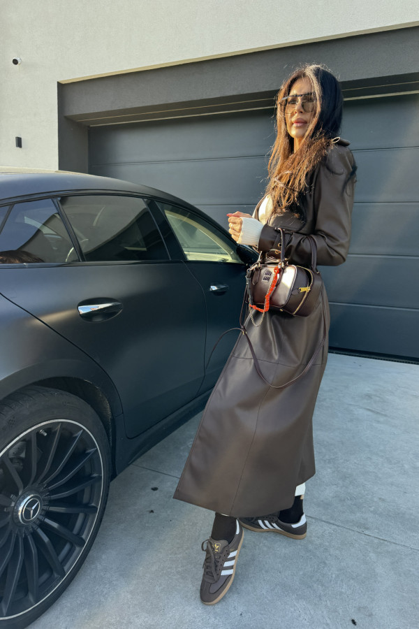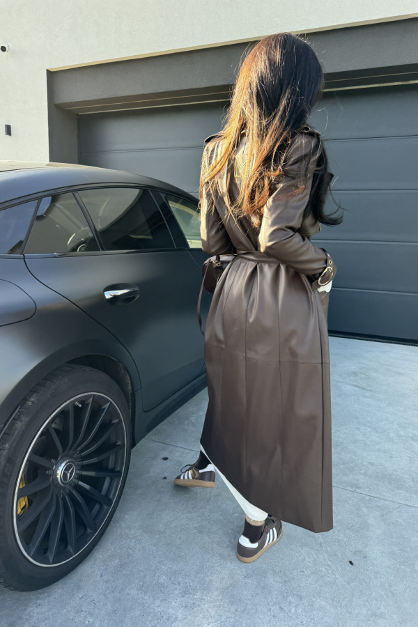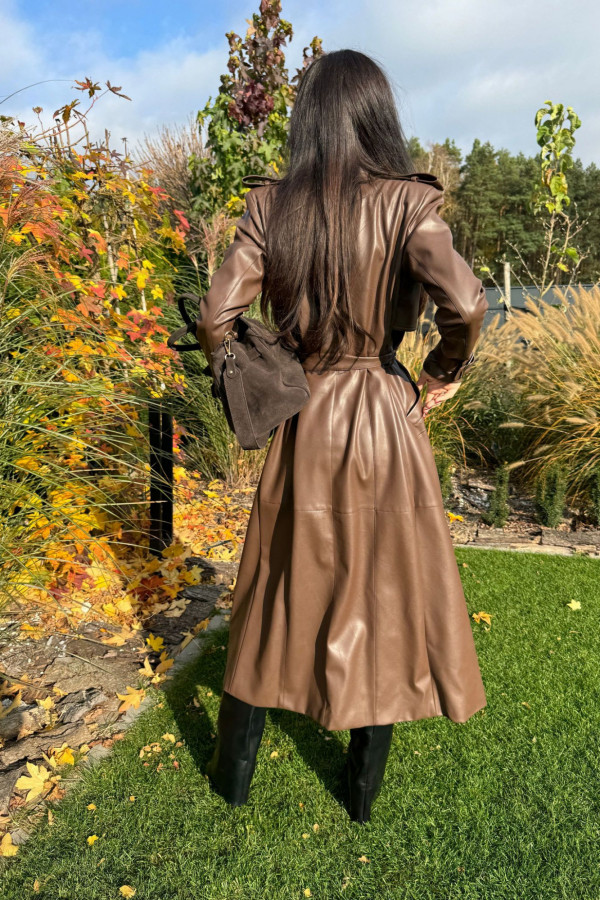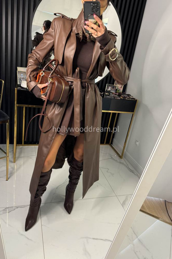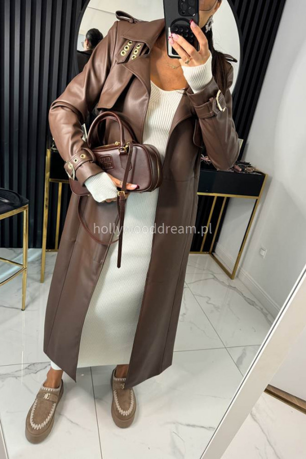 Płaszcz skórzany MONA w kolorze czekoladowym to luksusowy element garderoby, który łączy klasyczny styl z nowoczesnym wykończeniem. Wykonany z wysokiej jakości imitacji skóry , zapewnia elegancki wygląd i trwałość na długie lata. Jego głęboki burgundowy odcień nadaje mu wyjątkowego charakteru, doskonale wpisując się w aktualne trendy modowe. Zapewnij sobie ciepło i styl tej zimy z Hollywood Dream! Model dostępny jest w rozmiarach S-L.