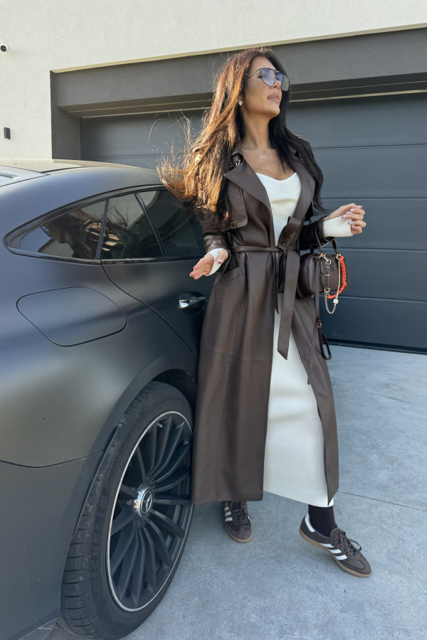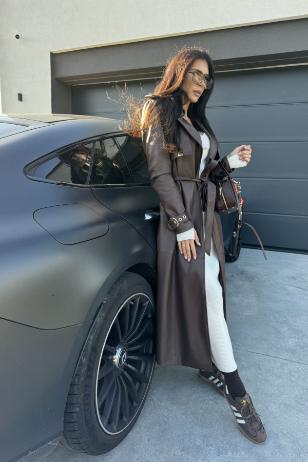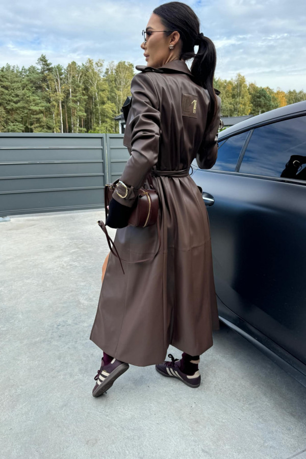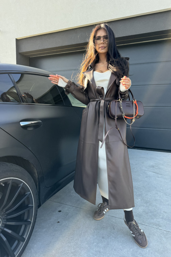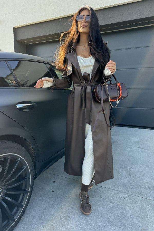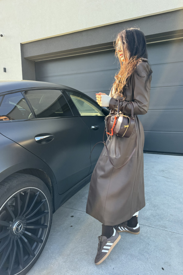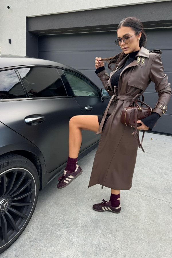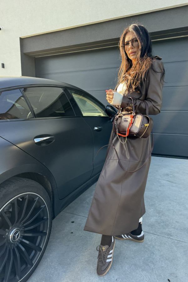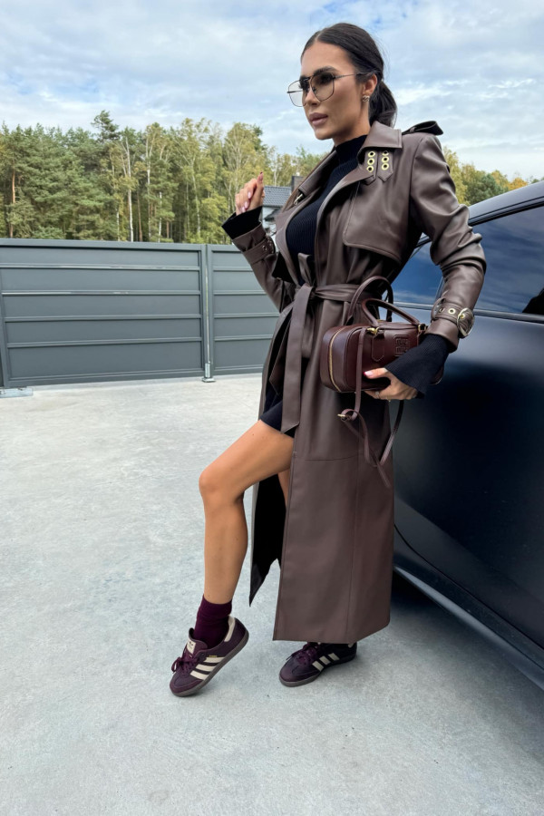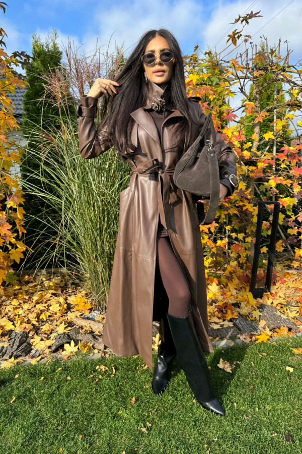 Płaszcz skórzany MONA w kolorze czekoladowym to luksusowy element garderoby, który łączy klasyczny styl z nowoczesnym wykończeniem. Wykonany z wysokiej jakości imitacji skóry , zapewnia elegancki wygląd i trwałość na długie lata. Jego głęboki burgundowy odcień nadaje mu wyjątkowego charakteru, doskonale wpisując się w aktualne trendy modowe. Zapewnij sobie ciepło i styl tej zimy z Hollywood Dream! Model dostępny jest w rozmiarach S-L.
