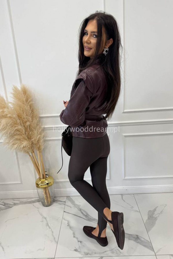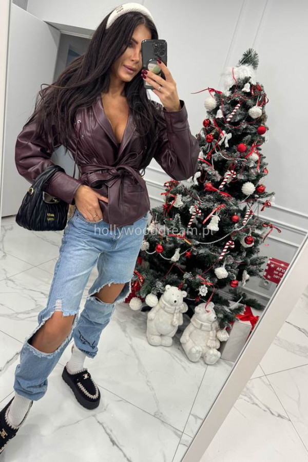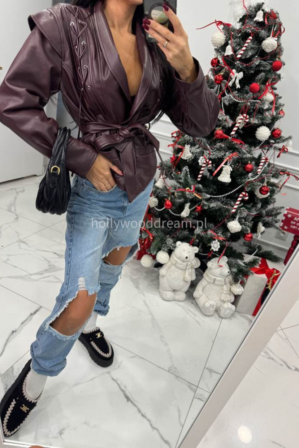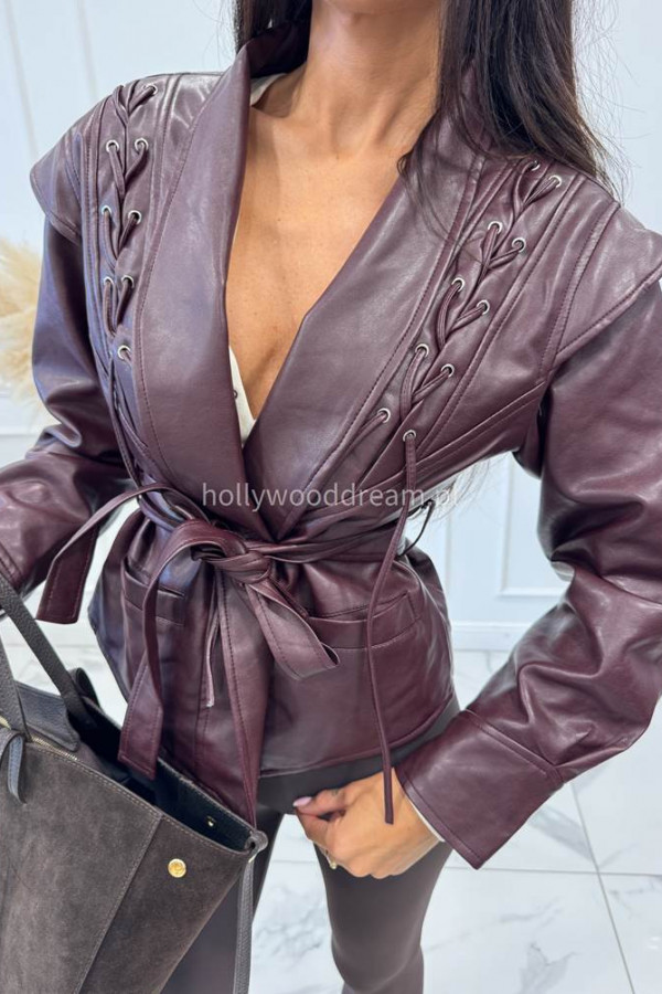 Kurtka skórzana zdobiona sznurowaniem i paskiem bordowa ATENA