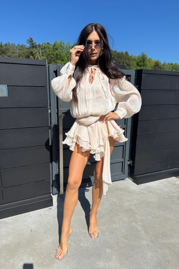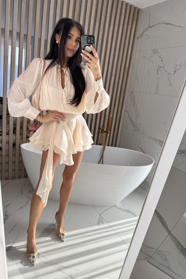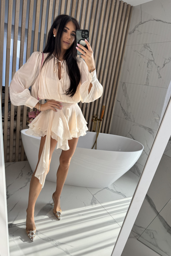 Kombinezon al'a sukienka połyskująca z opływającego materiału JENNY morelowa to doskonałe połączenie szykownej sukienki i wygody kombinezonu! Wykonany z lekkiego, opływającego materiału, który subtelnie połyskuje, sprawia, że każdy ruch nabiera gracji i elegancji. Morelowy odcień dodaje świeżości i dziewczęcego uroku, podkreślając naturalne piękno.