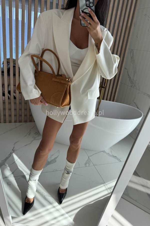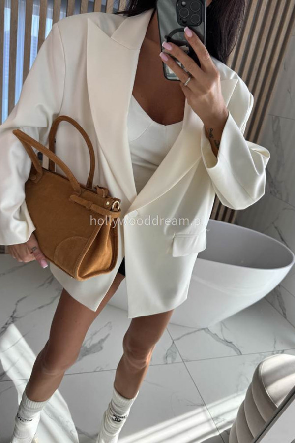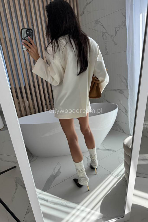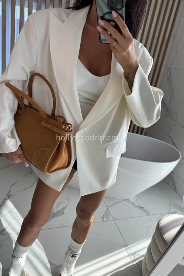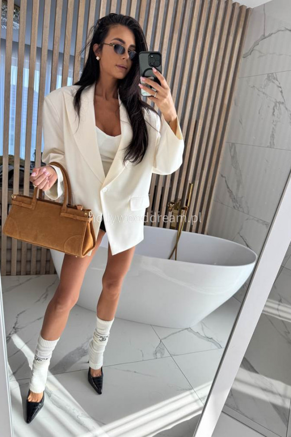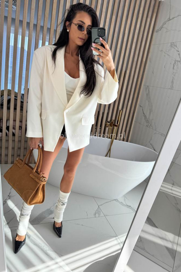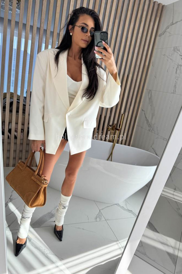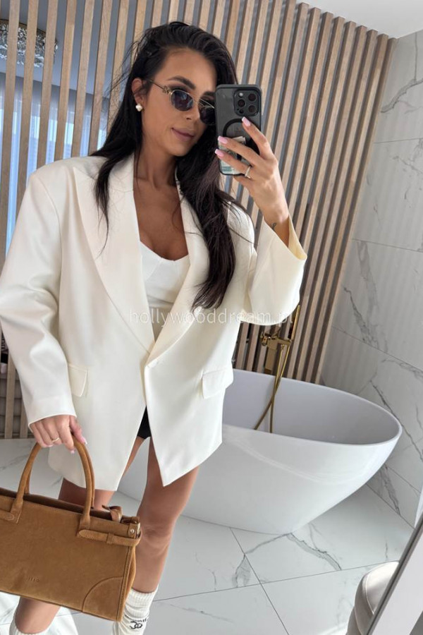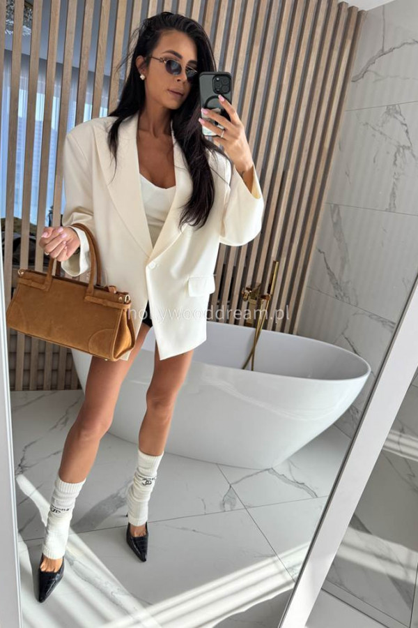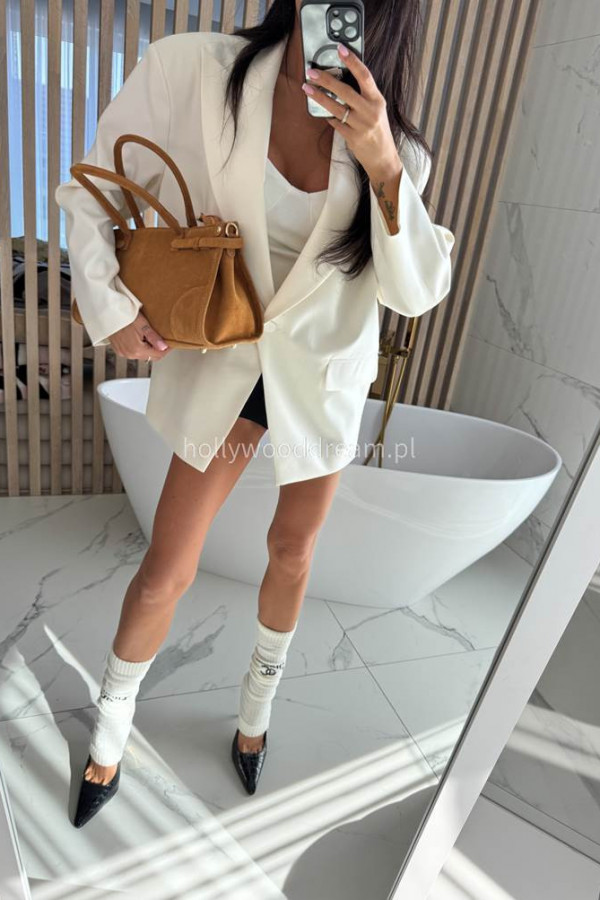 Marynarka na jeden guzik SOFIA kremowa to elegancki i nowoczesny wybór dla kobiet, które pragną dodać swojej garderobie odrobinę luksusu. Wykonana z wysokiej jakości materiałów, marynarka świetnie układa się na sylwetce, podkreślając atuty figury. Zapięcie na jeden guzika nadaje jej klasyczny, a zarazem minimalistyczny charakter, idealny zarówno do biurowych stylizacji, jak i na wieczorne wyjścia. Marynarka w tym odcieniu wprowadza ciepło i wyrafinowanie, sprawiając, że marynarka wyróżnia się wśród innych elementów garderoby. Połącz ją z dopasowanymi spodniami lub spódnicą, aby stworzyć efektowny i elegancki look na każdą okazję! Model dostępny w rozmiarze uniwersalnym.