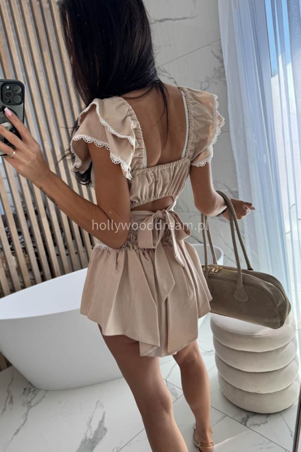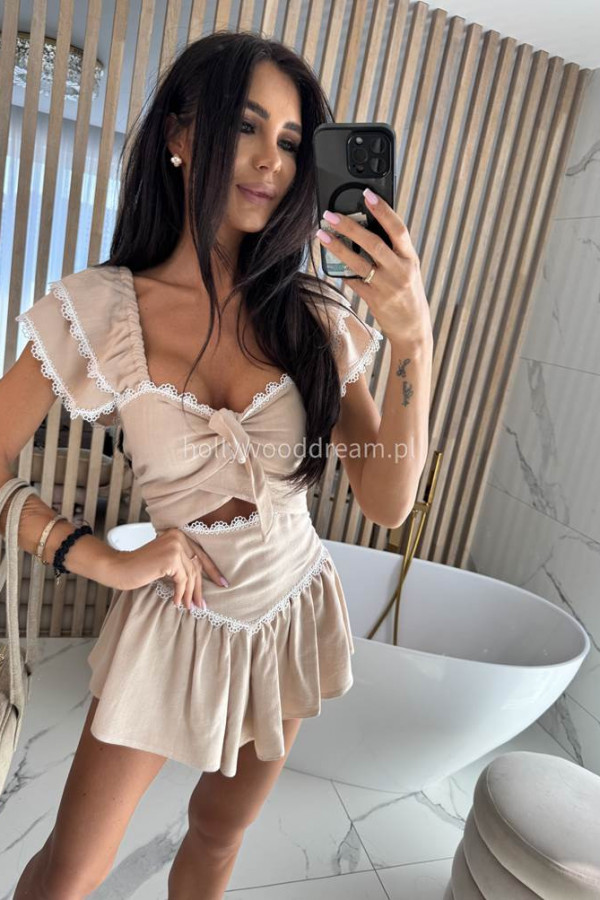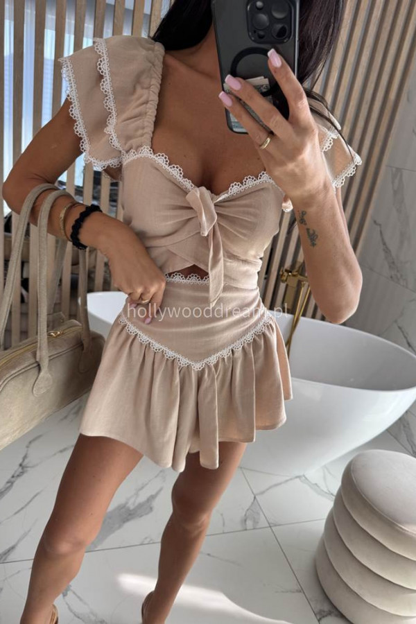 Komplet top+ spódnico-spodenki z wiskozy i lnu OSLO beżowy to kwintesencja kobiecej lekkości i letniego uroku. Wykonany z przewiewnej mieszanki wiskozy i lnu, zapewnia komfort noszenia nawet w upalne dni, a jego romantyczny design przyciąga uwagę subtelnymi detalami i delikatnym wykończeniem. Górę zestawu stanowi krótki top z uroczym wiązaniem na biuście. Dodatkowo ozdobiony jest falbankami na ramionach oraz subtelną koronką, która dodaje mu finezji i dziewczęcego wdzięku. Spódnico-spodenki idealnie dopełniają całość – posiadają wygodną formę i efektowne wykończenie falbanami i koronką, co sprawia, że wyglądają jak romantyczna spódniczka, zachowując wygodę szortów. Ten komplet idealnie sprawdzi się na lato – na spacery, spotkania, wakacje, a nawet na romantyczne wieczory przy zachodzie słońca.