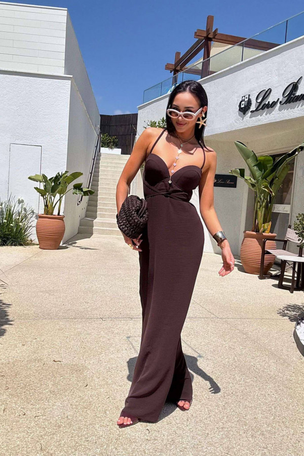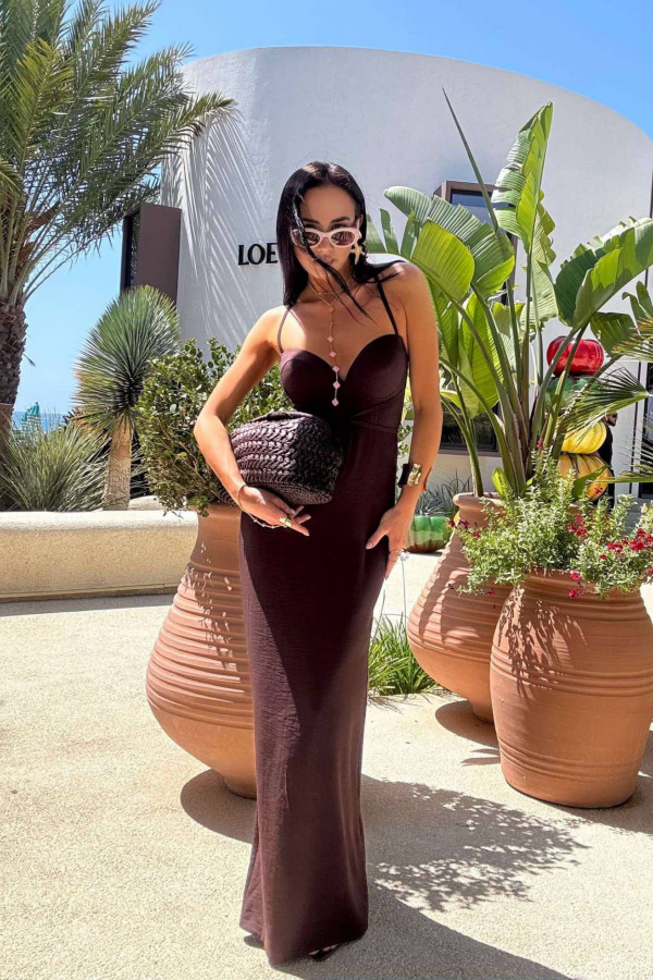 Sukienka maxi gorsetowa z wiązaniem z wiskozy OLIMP czekoladowa 25