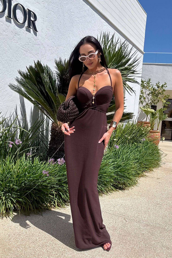 - Sukienka maxi gorsetowa z wiązaniem z wiskozy OLIMP czekoladowa