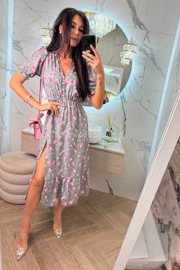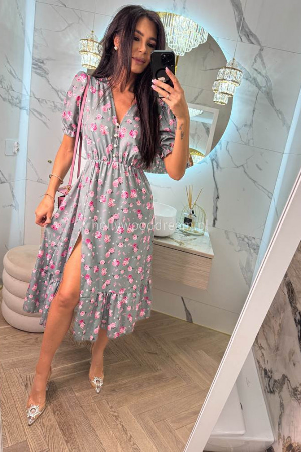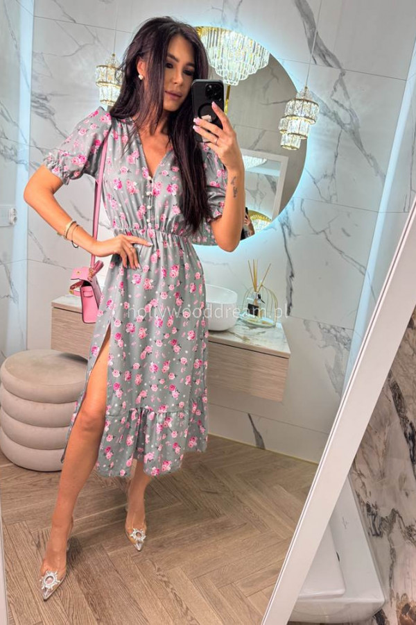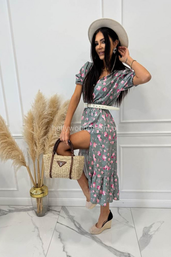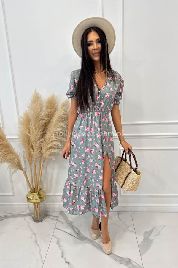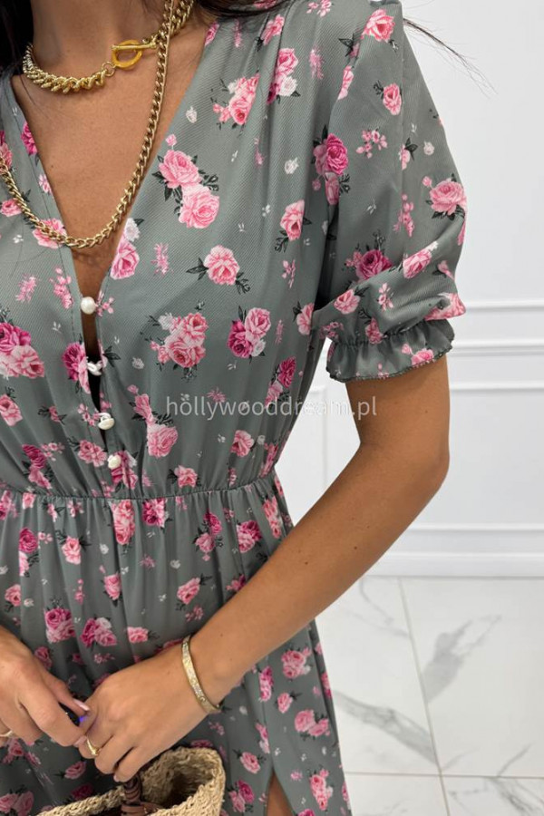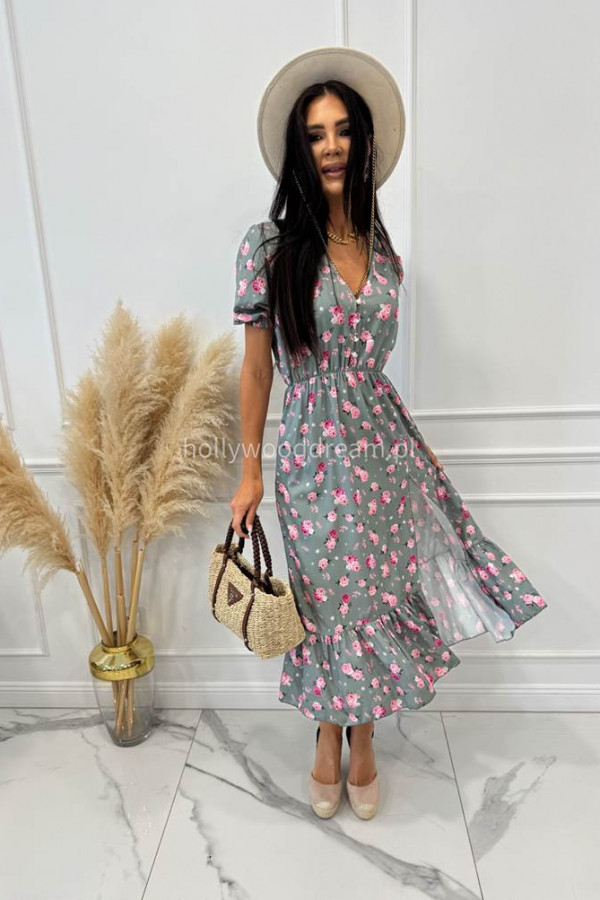 - Sukienka midi na krótki rękaw Megan ciemno zielona w różowe róże