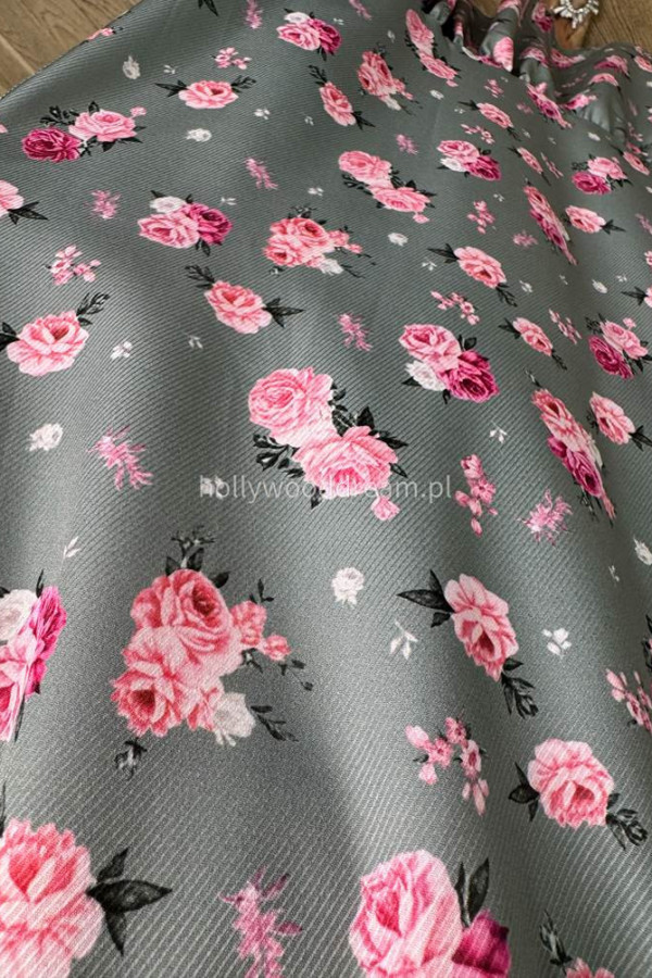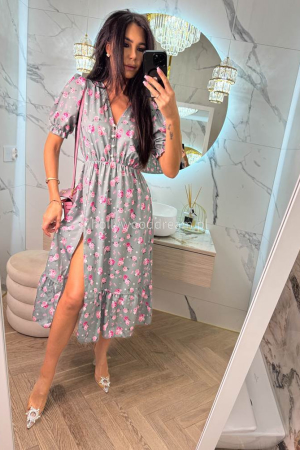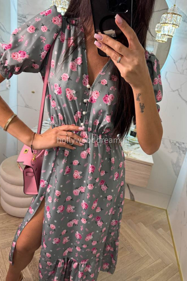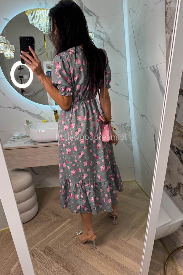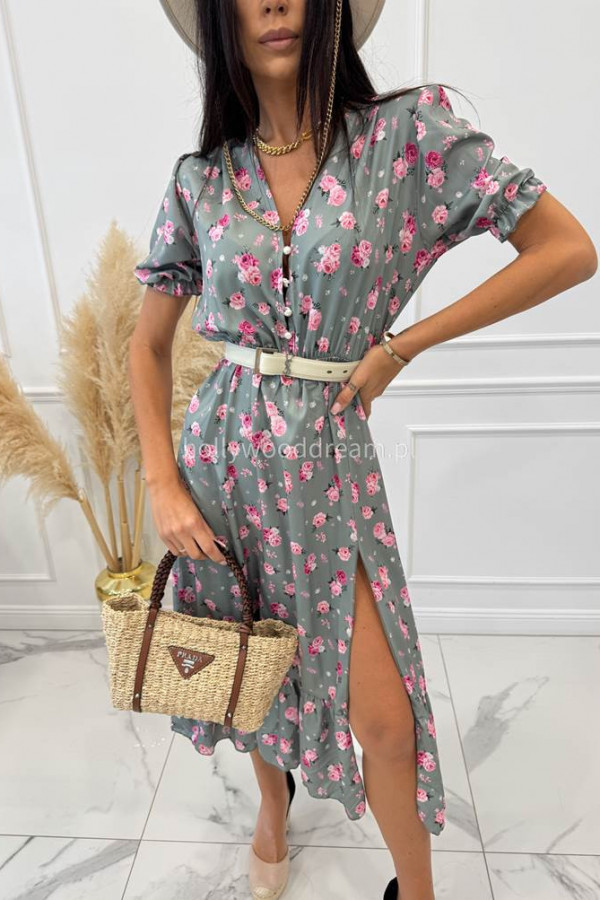 Sukienka midi na krótki rękaw Megan ciemno zielona w różowe róże 172