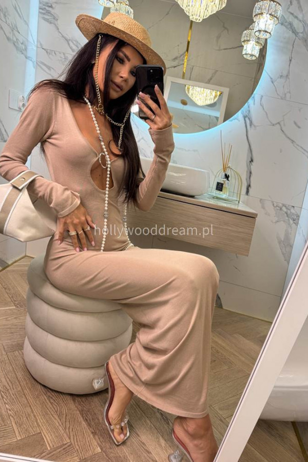 Sukienka plażowa z głębokim dekoltem i odkrytymi plecami 100% wiskoza MAROKO beżowa to wyjątkowa propozycja na lato dla kobiet, które lubią łączyć zmysłowość z wygodą. Wykonana z lekkiego, przewiewnego materiału, doskonale sprawdzi się jako stylizacja plażowa i na letnie wyjścia. Głęboki dekolt ozdobiony dekoracyjnym metalowym kołem przyciąga uwagę i dodaje nowoczesnego akcentu. Zmysłowe odkryte plecy subtelnie eksponują sylwetkę, a długi rękaw równoważy fason, wprowadzając nutę elegancji. MAROKO to sukienka, która doskonale wpisuje się w letni klimat kurortów i egzotycznych podróży. Noś ją z klapkami, sandałkami lub na boso – w każdej wersji wygląda spektakularnie.