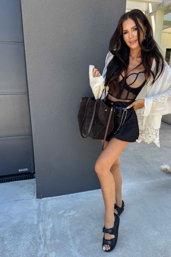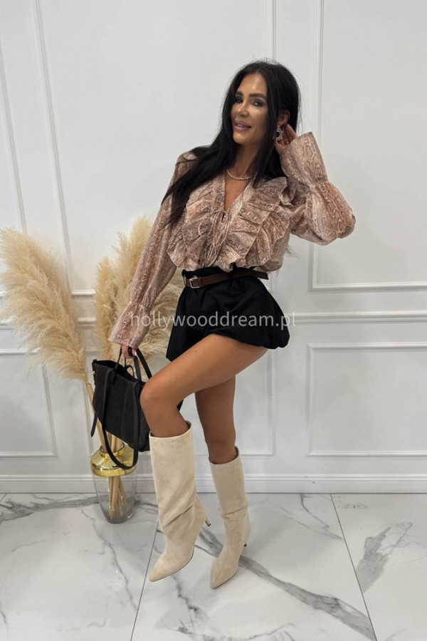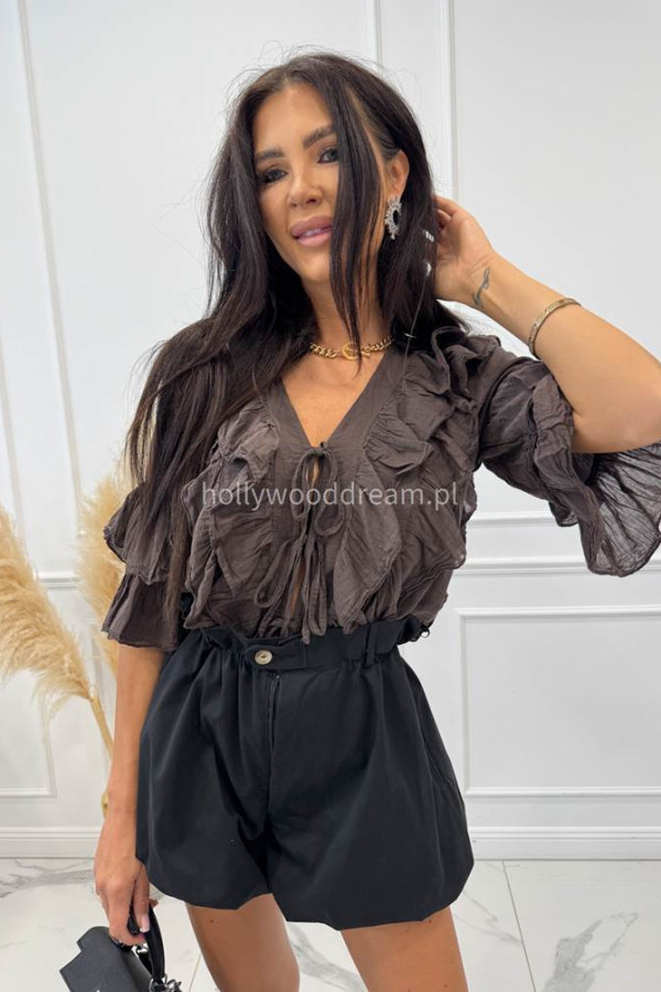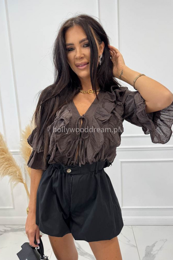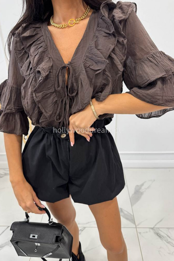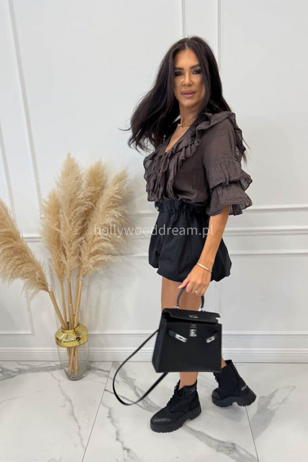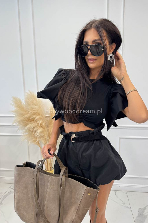Spodenki krótkie bombka JULIETTA czarne to modna alternatywa dla klasycznych szortów. Ich delikatnie zaokrąglony, lekko bufiasty krój pięknie modeluje sylwetkę i nadaje stylizacji kobiecego, nowoczesnego charakteru.Wykonane z lekkiego, komfortowego materiału, idealnie sprawdzą się w cieplejsze dni. Czarny kolor to ponadczasowa baza, którą łatwo zestawisz zarówno z elegancką bluzką, jak i sportowym T-shirtem. Elastyczna talia zapewnia wygodę i świetne dopasowanie.
