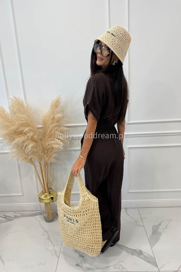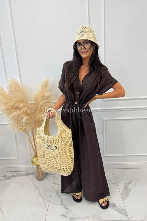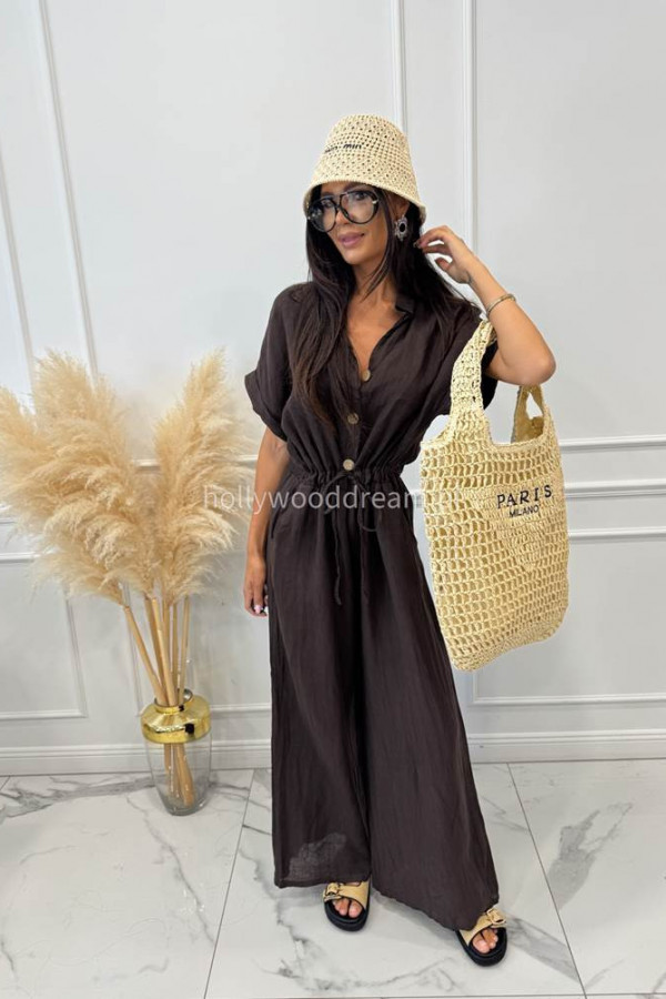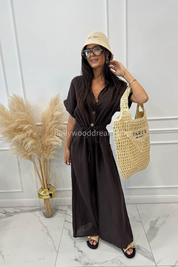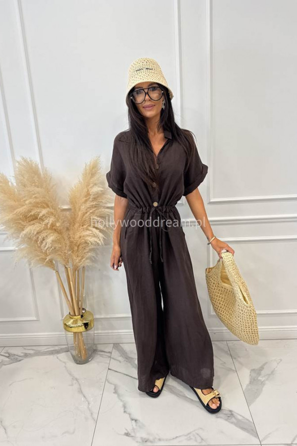 - Kombinezon długi na guziki z gumką w talii 100% len RAUL czekoladowy
