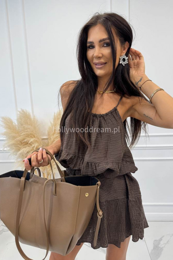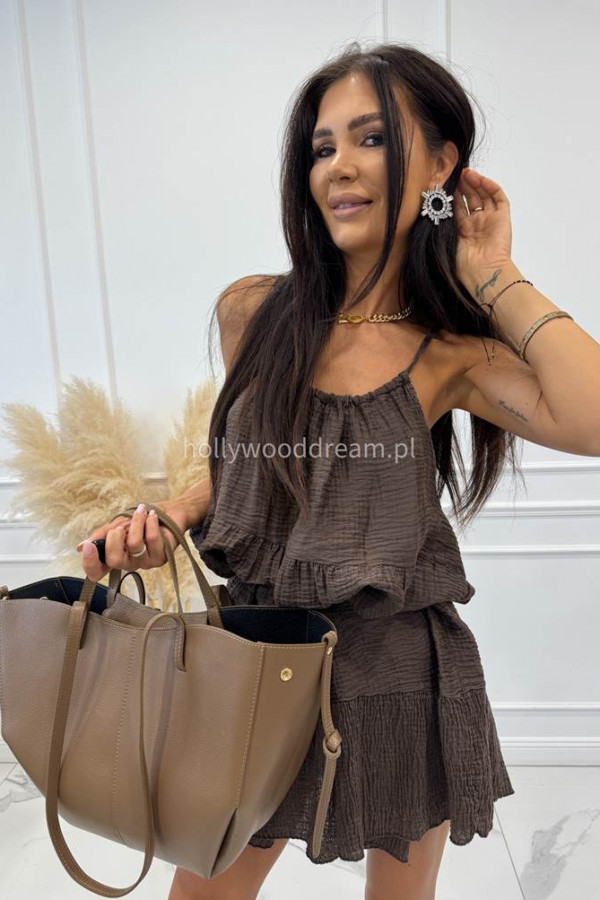 - Sukienka mini na ramiączkach z przeszyciami z wiskozą KLARA czekoladowa