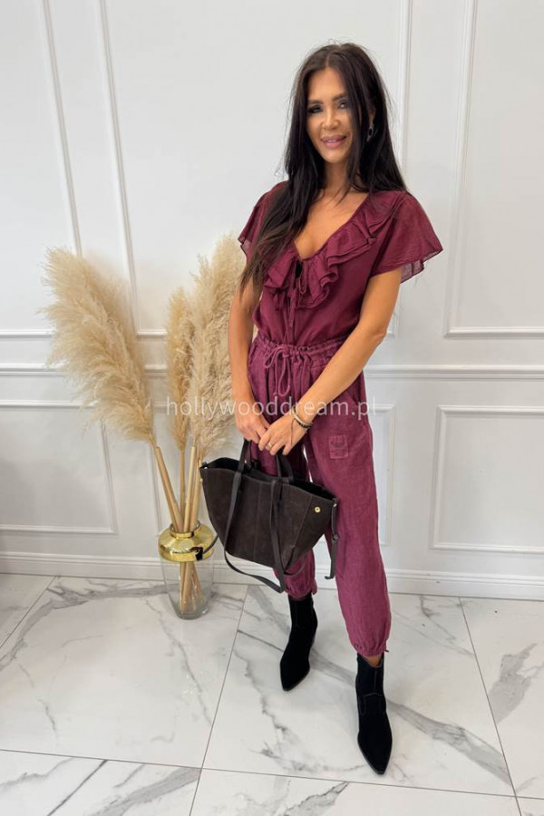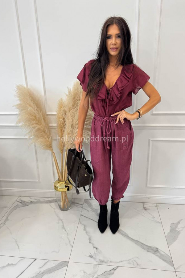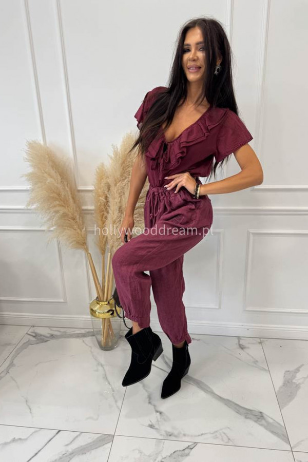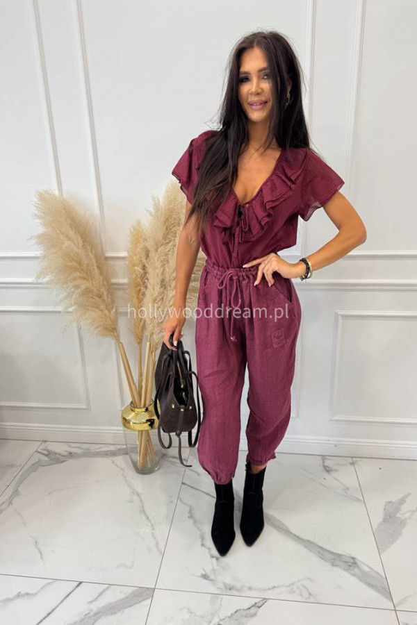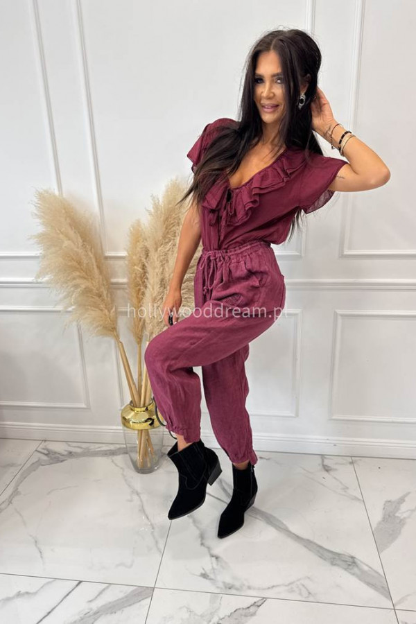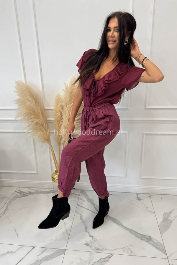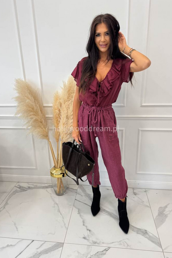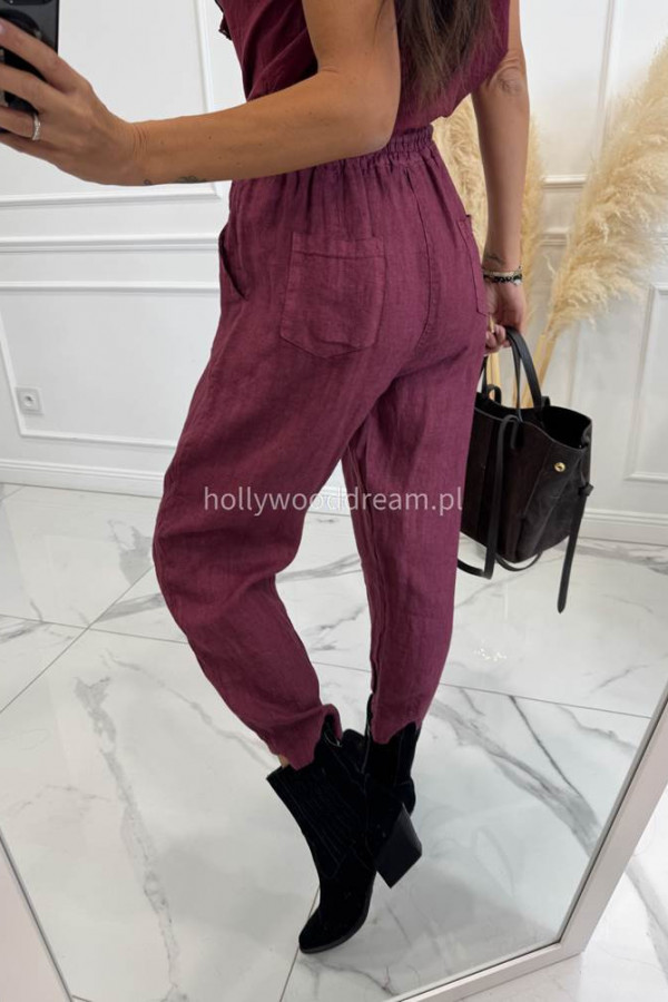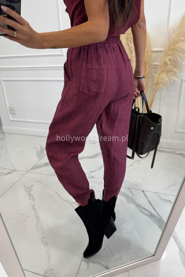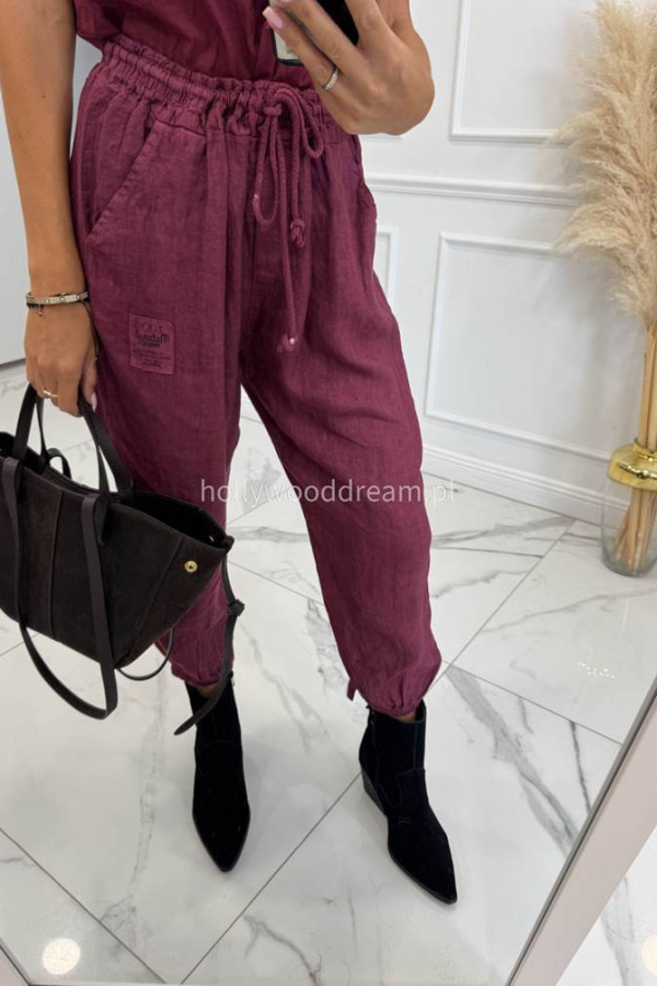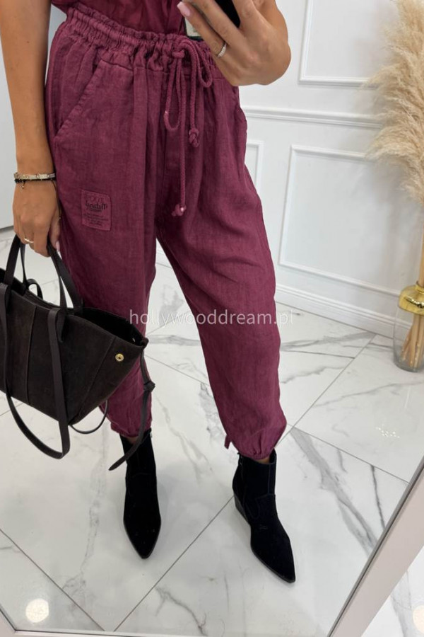 Spodnie 100 % len z wiązaniem w pasie bordowe KSENIA