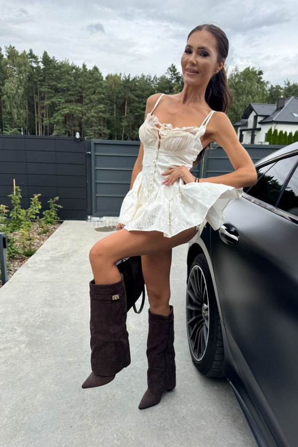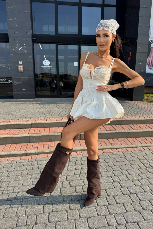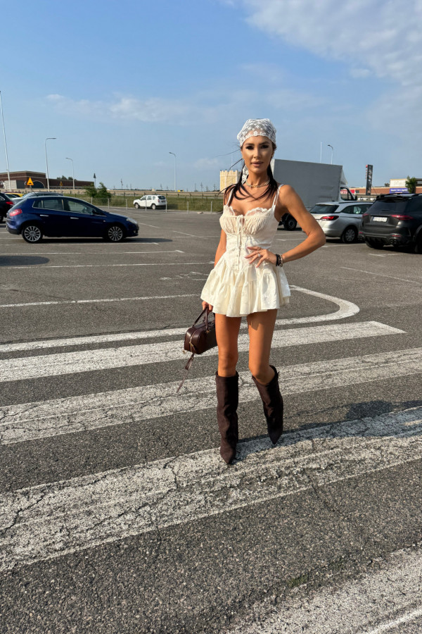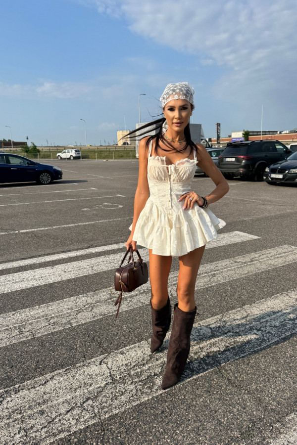 Kremowy sukienko-kombinezon PRINCESS to połączenie dziewczęcego uroku z pazurem. Góra stylizowana na sukienkę z romantyczną falbaną i ozdobnymi guzikami, a dół w formie wygodnych szortów zapewnia swobodę i lekkość. Model PRINCESS to idealny wybór na letnie randki, garden party lub wakacyjne spacery. Subtelny kolor pięknie podkreśla opaleniznę, a lekko taliowany krój akcentuje sylwetkę. To outfit, który wygląda jak sukienka, ale nosi się jak komfortowy kombinezon!