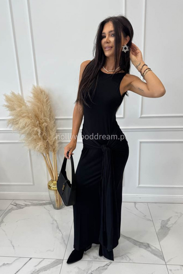 Sukienka maxi na ramiączkach z wiązaniem i marszczeniem czarna TINA