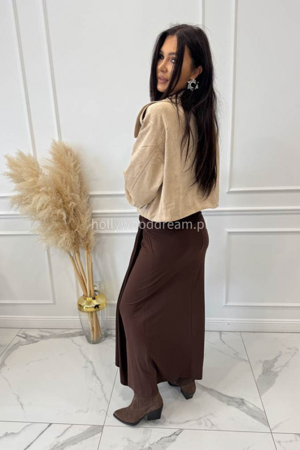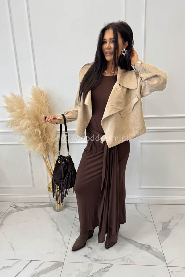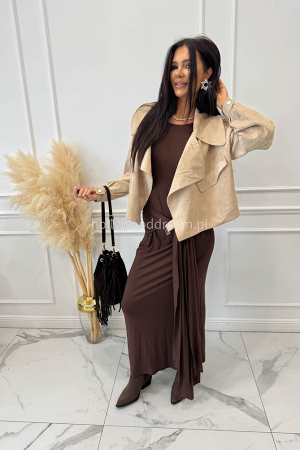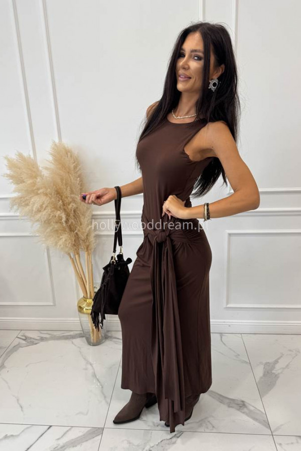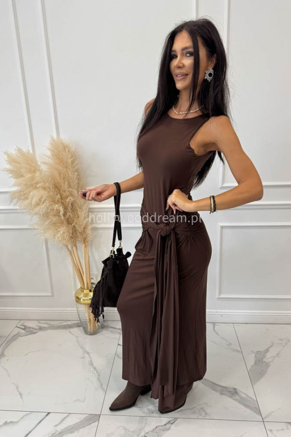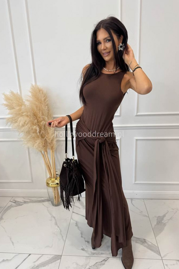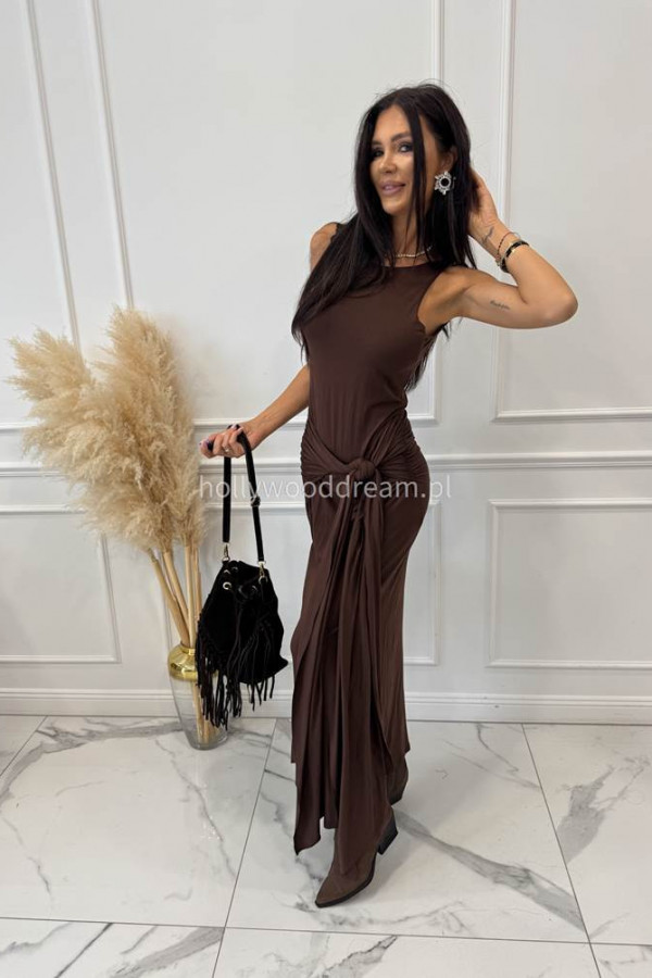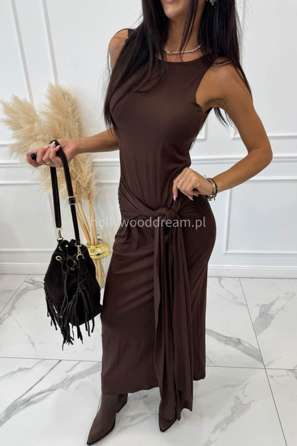 - Sukienka maxi na ramiączkach z wiązaniem i marszczeniem czekoladowa TINA