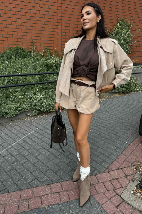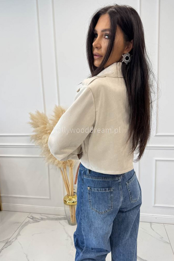 Kurtka krótka zamszowa jasno beżowa Ola to lekka i stylowa propozycja na cieplejsze dni. Nieocieplana, z miękkiego materiału, zapewnia komfort noszenia i swobodę ruchów. Zamiast klasycznego zapięcia posiada subtelny pasek z klamrą do przełożenia, co dodaje jej nowoczesnego charakteru. Idealna do casualowych i miejskich stylizacji.