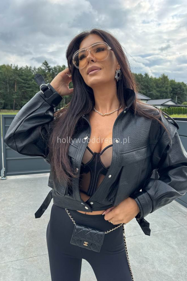 Kurtka MAJKI to stylowa czarna bomberka z imitacji skóry ekologicznej o strukturze węża, zapinana na napy. Model wyróżnia się pagonami na ramionach oraz dużymi, praktycznymi kieszeniami, które dodają jej charakteru i funkcjonalności. Fason inspirowany militarnym stylem idealnie sprawdzi się w miejskich stylizacjach. To mocny, modowy akcent na chłodniejsze dni.