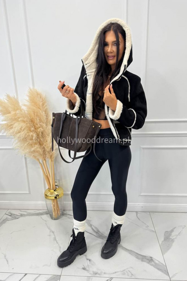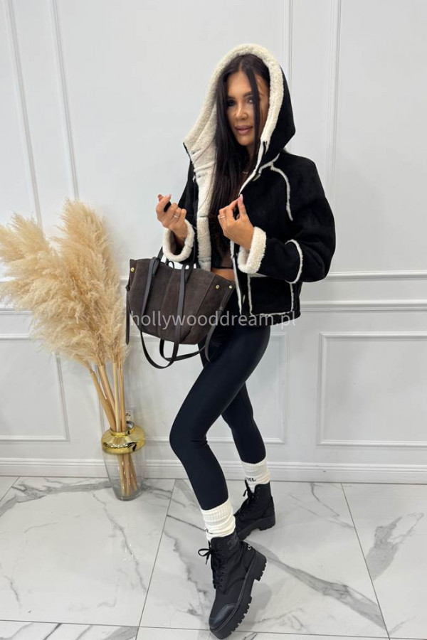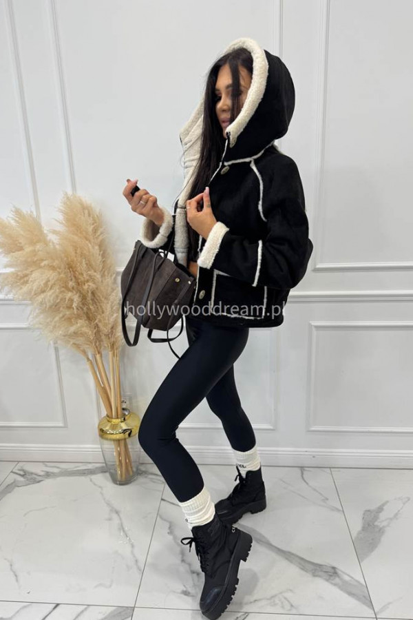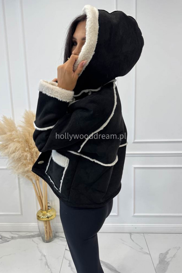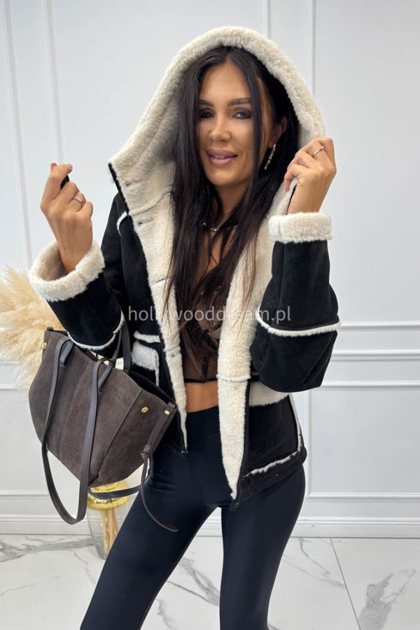 Kurtka zamszowa z kożuszkiem i kapturem czarna MORENA
