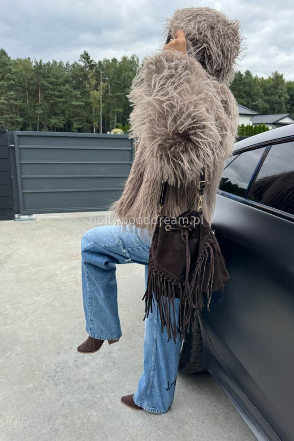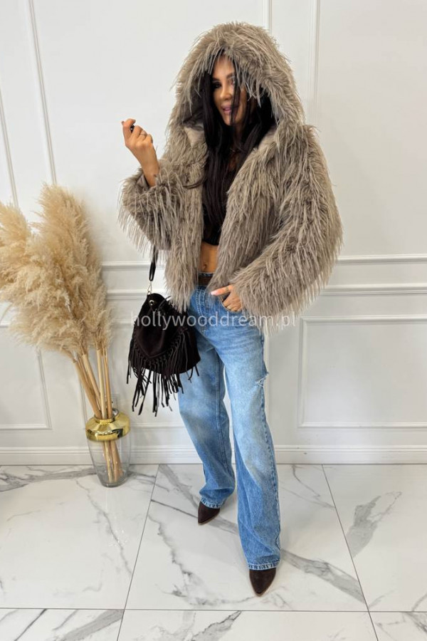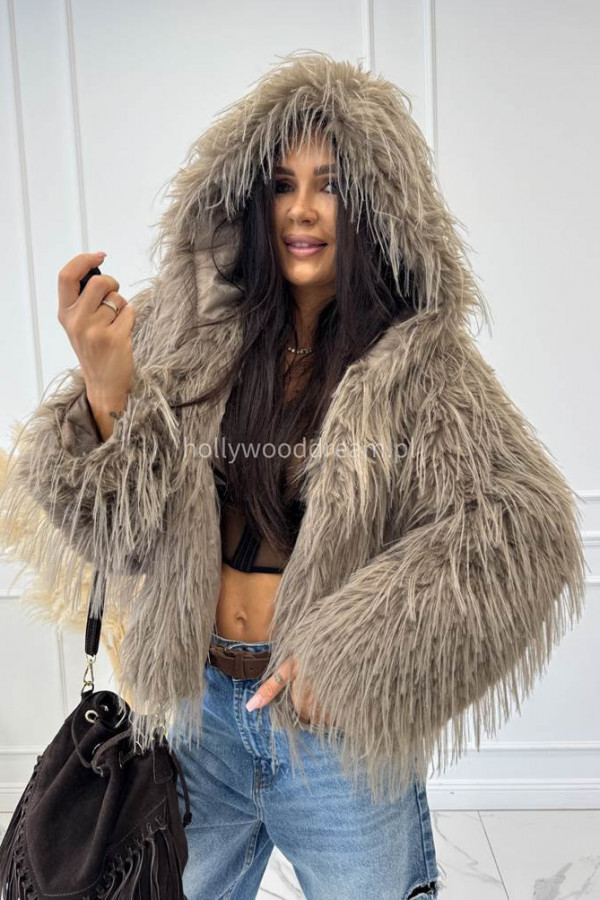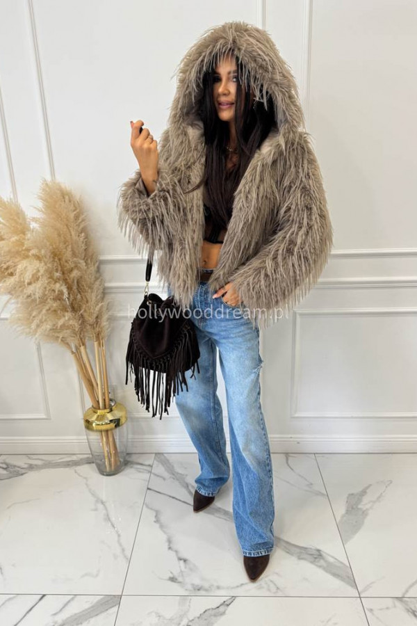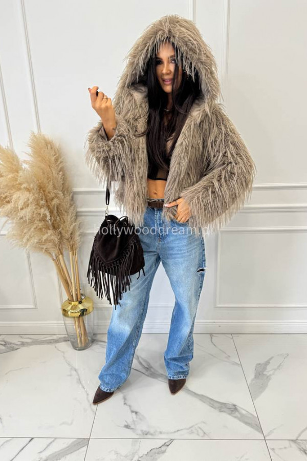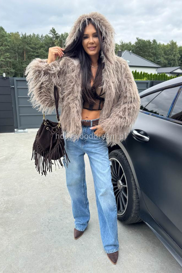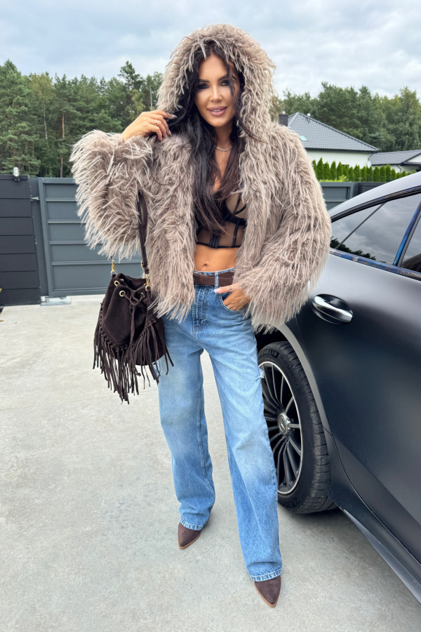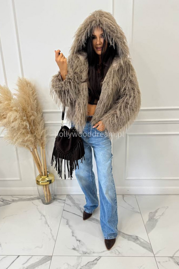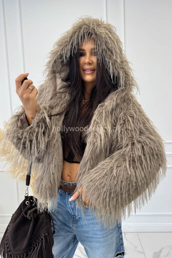 Futro z długim włosiem i kapturem mleczna czekolada LORENZO