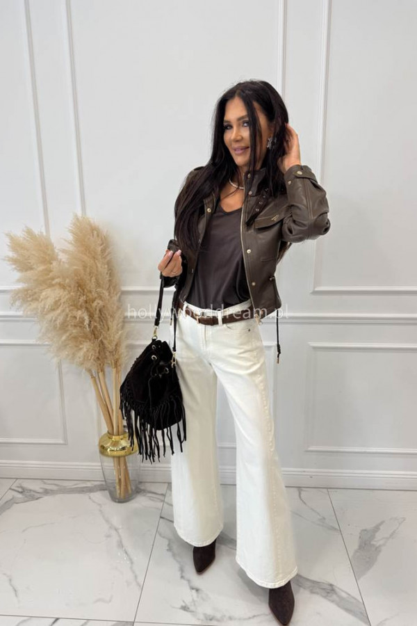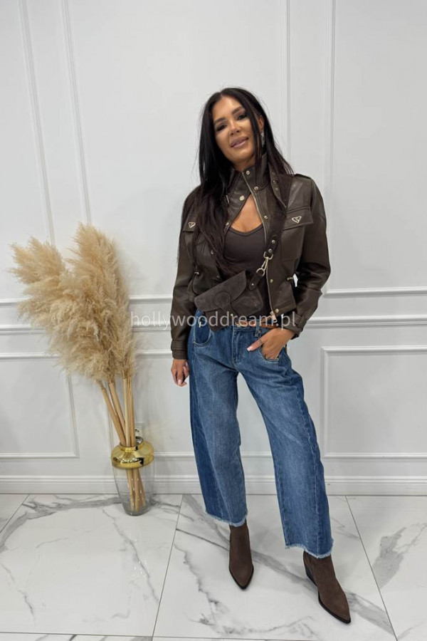 - Kurtka skórzana na złote napy i ściągacz czekoladowa MANIA