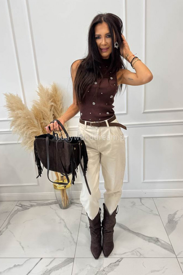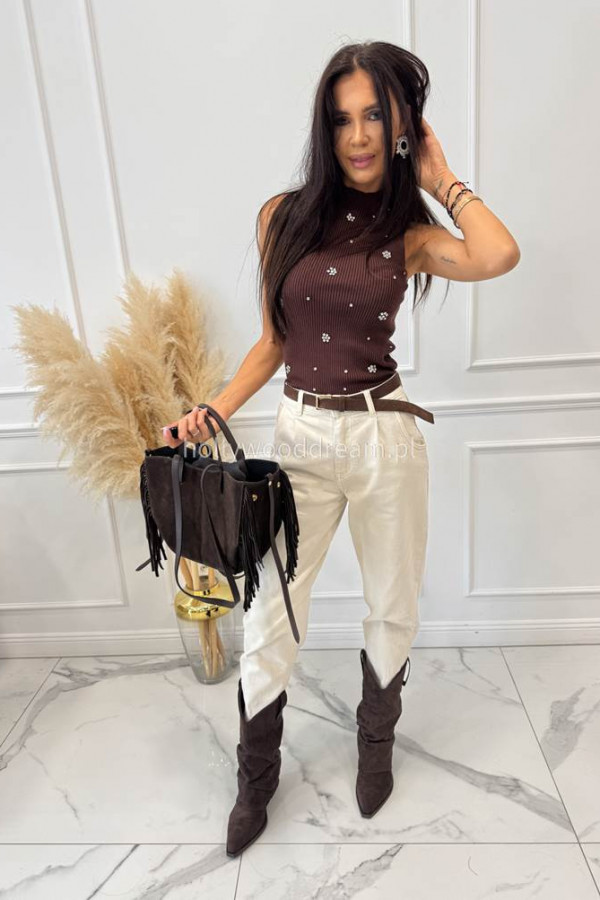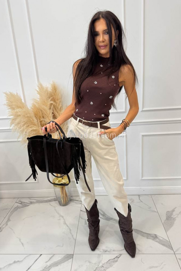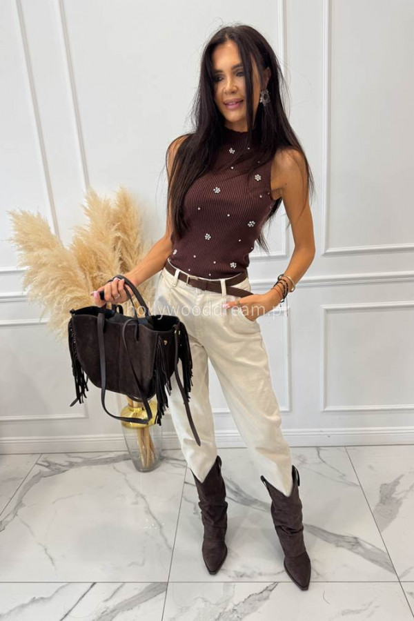 Bluzka z odkrytymi ramionami z ozdobnymi cyrkoniami brązowa HELENA