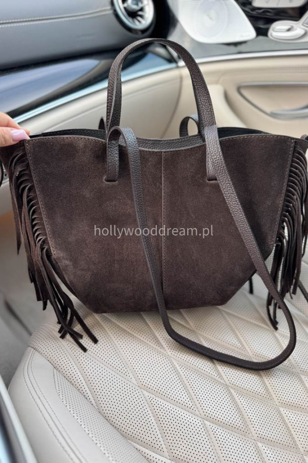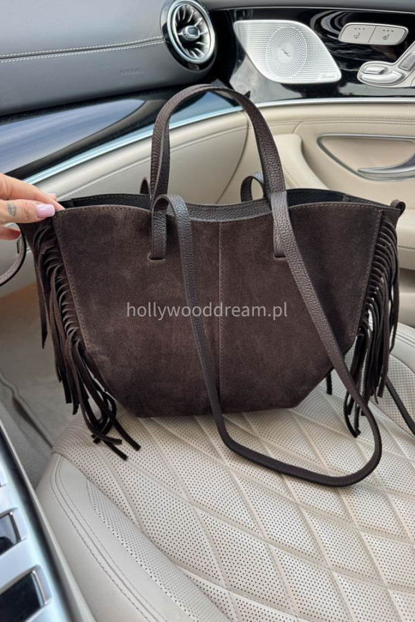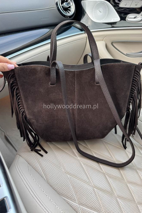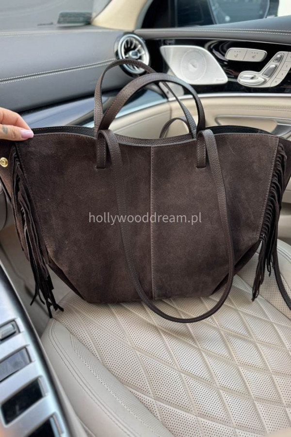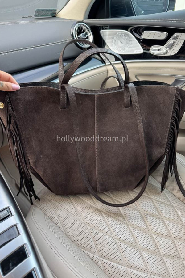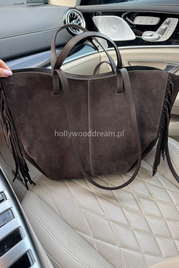 - Torebka shopper zamszowa duża z frędzlami brązowa KAJA