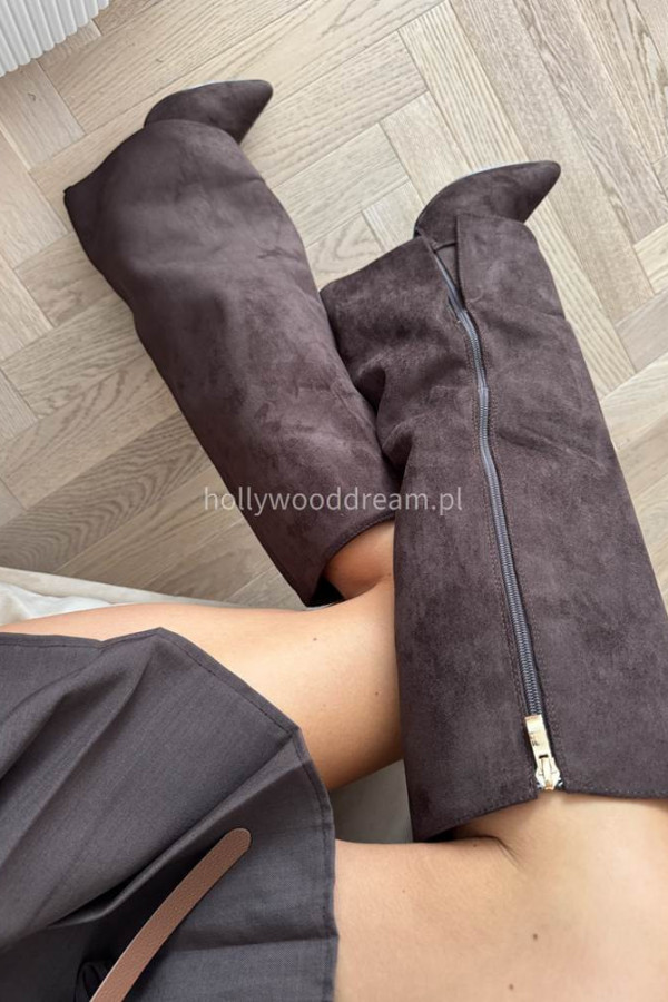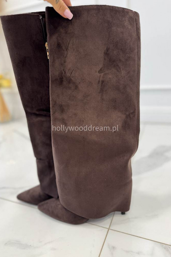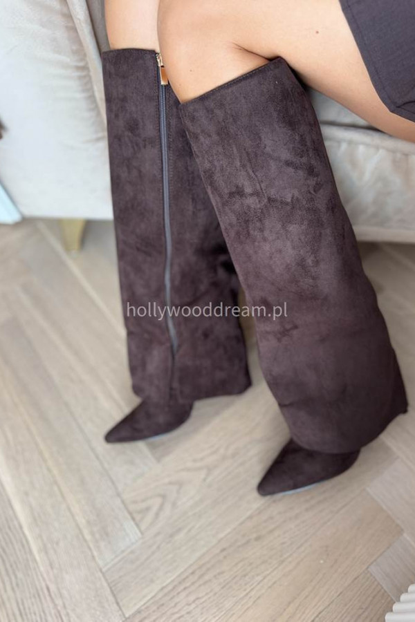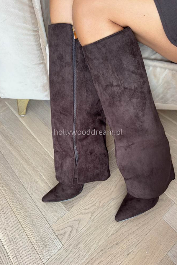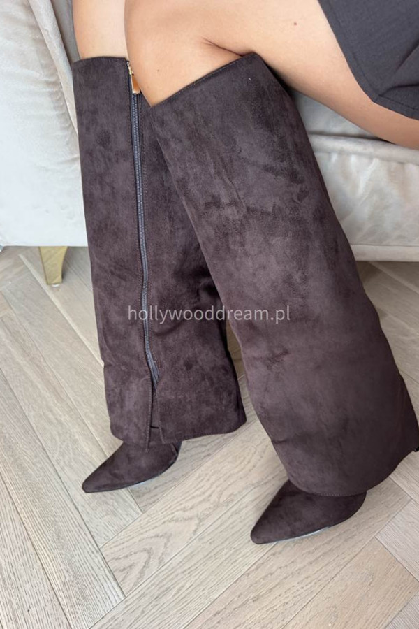 Kozaki z wywiniętą cholewką na szpilce zamszowe ciemny brąz ERNEST