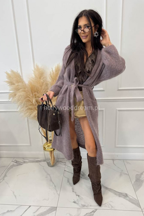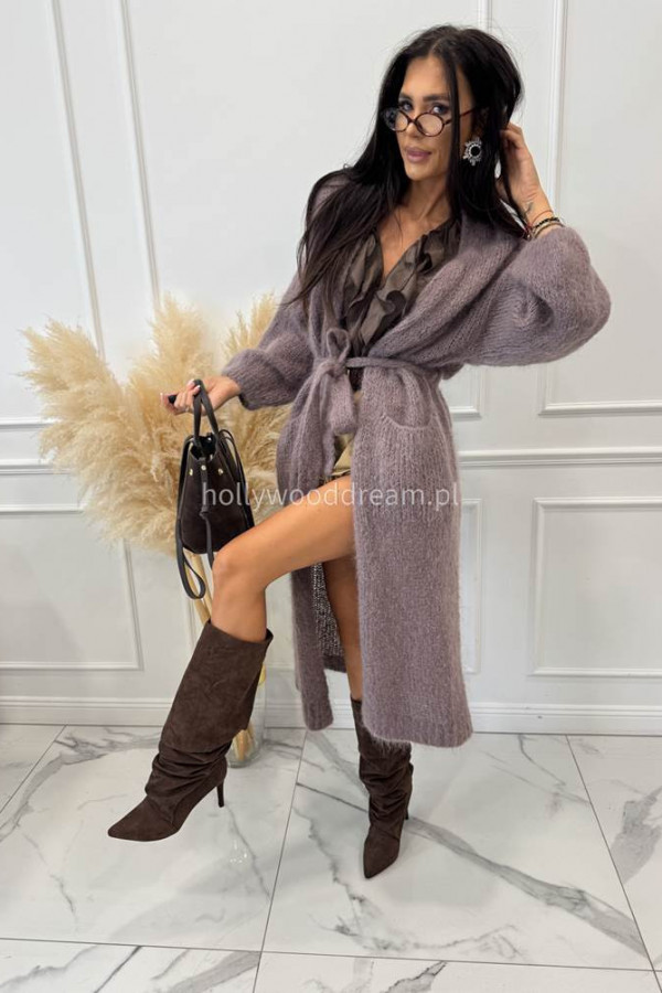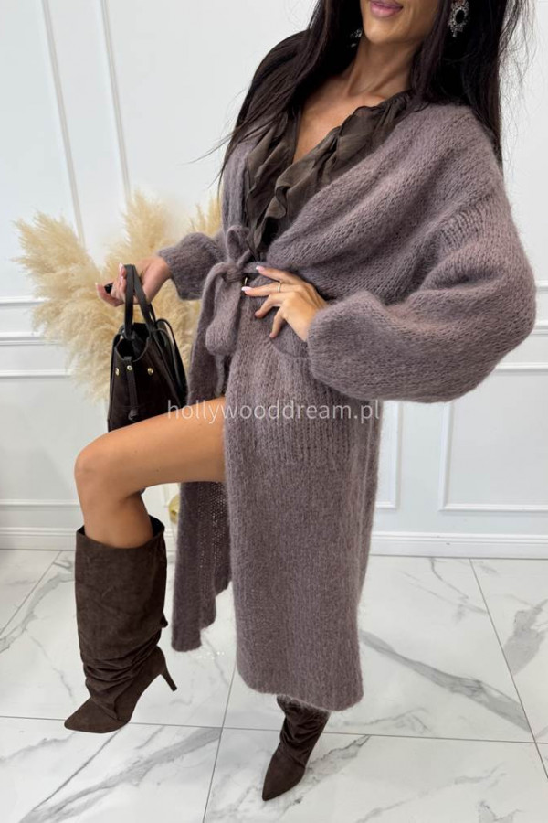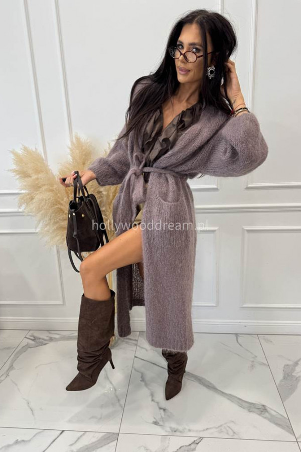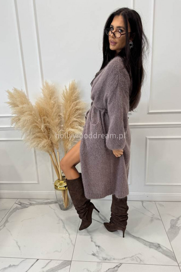 Kardigan długi z kieszeniami i paskiem mokka LEON 52