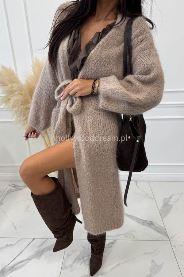 Kardigan długi z kieszeniami i paskiem beżowy LEON 52