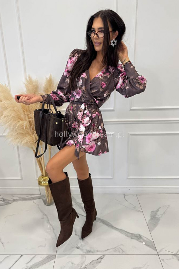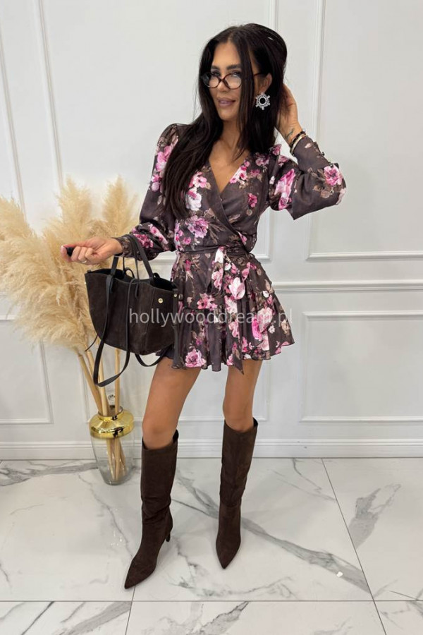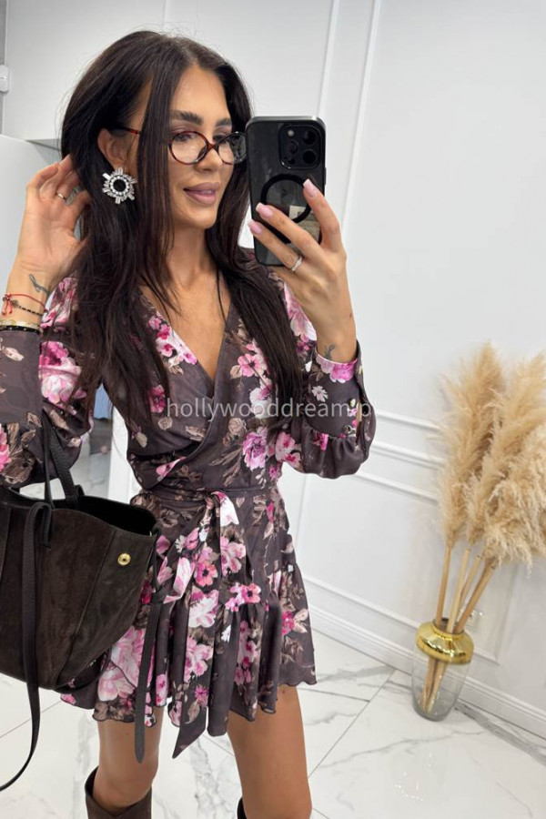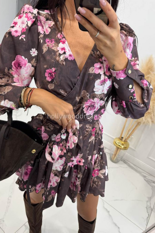 Sukienka mini kopertowa z wiązaniem czekoladowa w różowe kwiaty Oreo 121