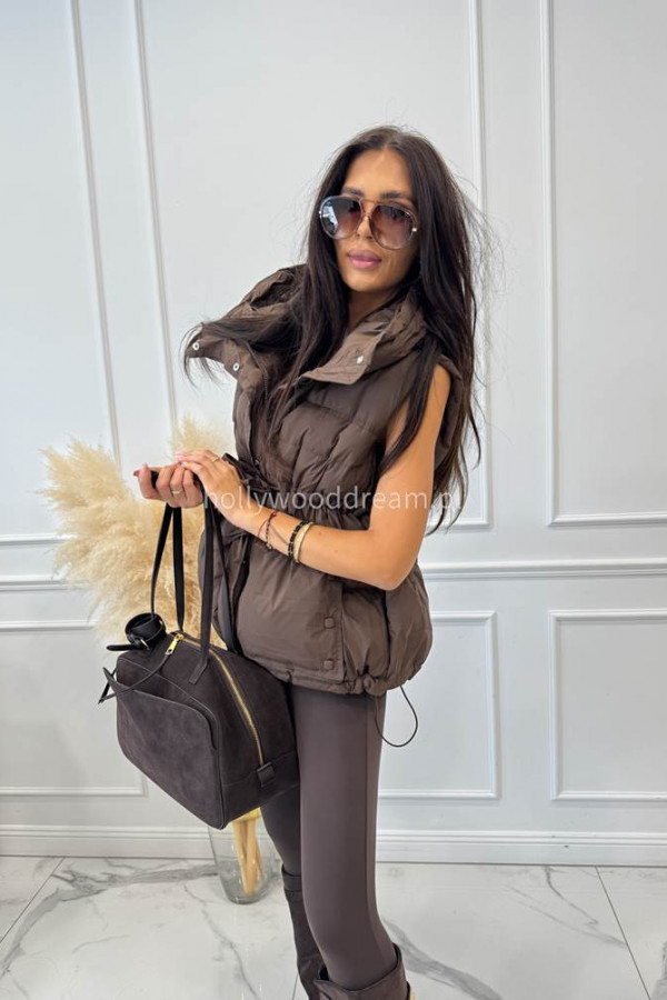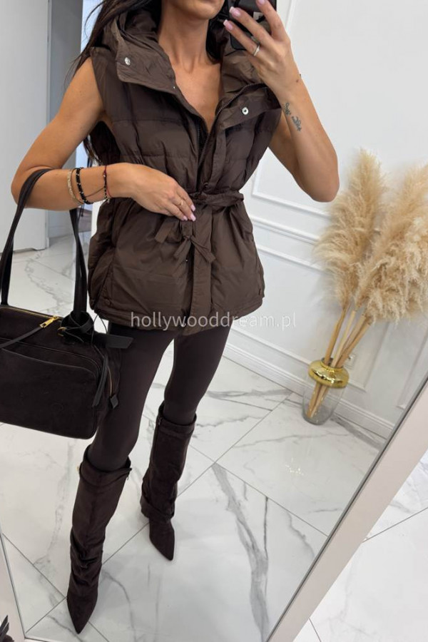 - Kamizelka puchowa dłuższa z kapturem i ściagaczem w talii czekoladowa ROKSANA