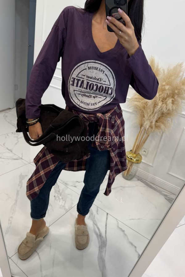 Bluzka CHOCOLATE to wygodny, bawełniany model w głębokim, fioletowym odcieniu, ozdobiony efektownym okrągłym nadrukiem na przodzie. Miękka tkanina zapewnia komfort noszenia, a luźny krój doskonale sprawdzi się w codziennych stylizacjach. To idealny wybór na spacer, spotkania z przyjaciółmi czy leniwe popołudnie w domu – zawsze modnie i wygodnie.