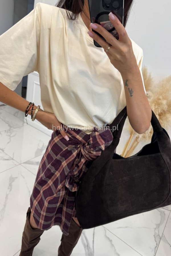 T-shirt bawełniany z poduszkami na ramionach kremowy WERA to absolutny must-have w każdej garderobie! Wykonany z wysokiej jakości bawełny, zapewnia maksymalny komfort i przewiewność, idealny na każdą porę roku. Luźny, oversize’owy krój gwarantuje swobodę ruchów i stylowy, nowoczesny look.