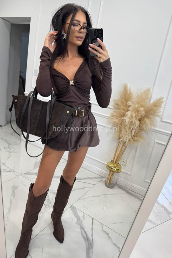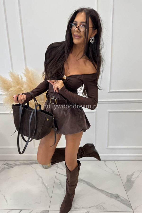 Bluzka z ozdobą na dekolcie na długi rękaw ciemna czekolada MARTA 30