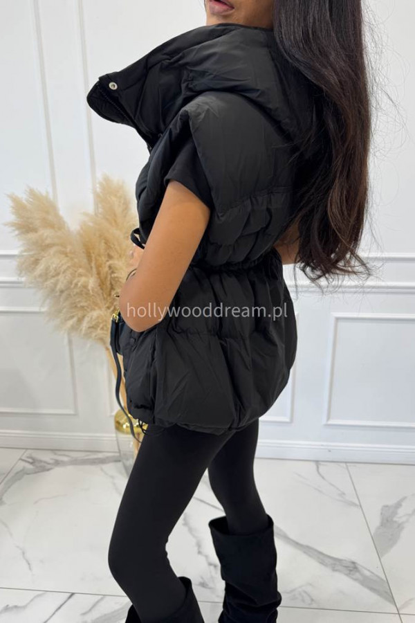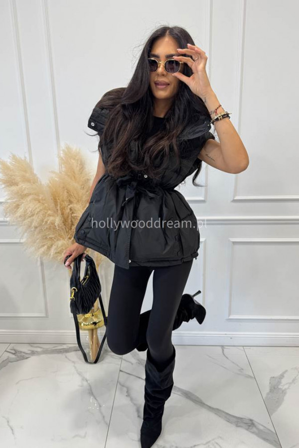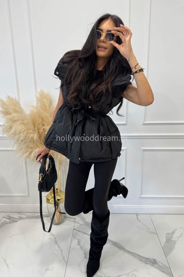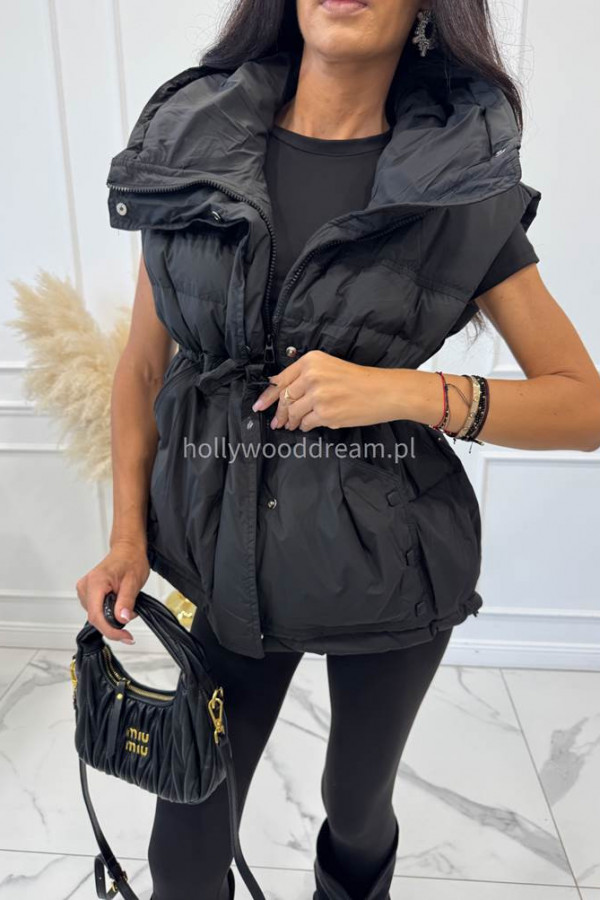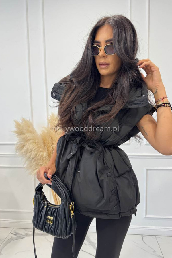 - Kamizelka puchowa dłuższa z kapturem i ściagaczem w talii czarna ROKSANA