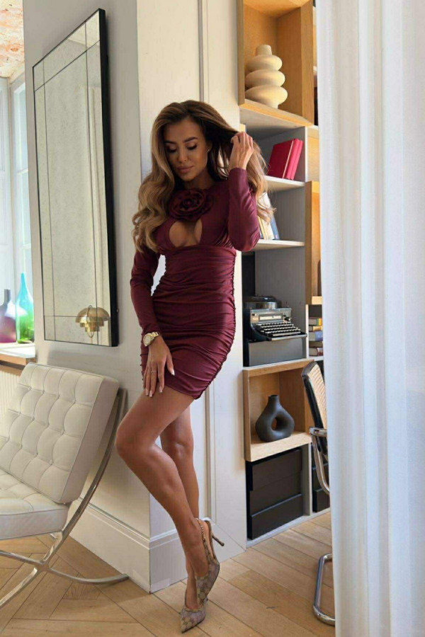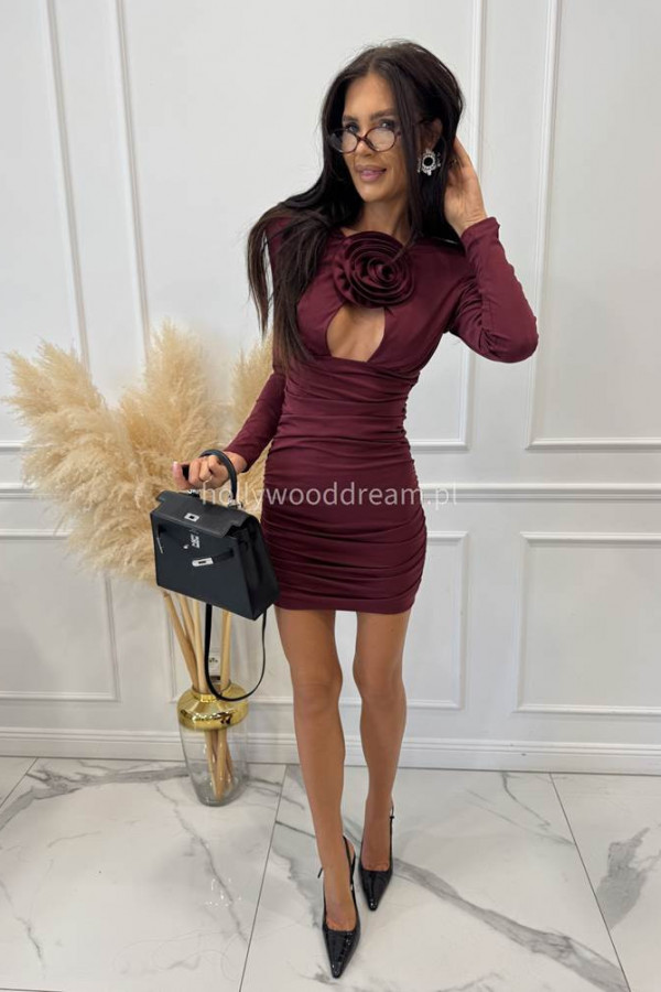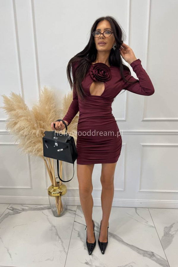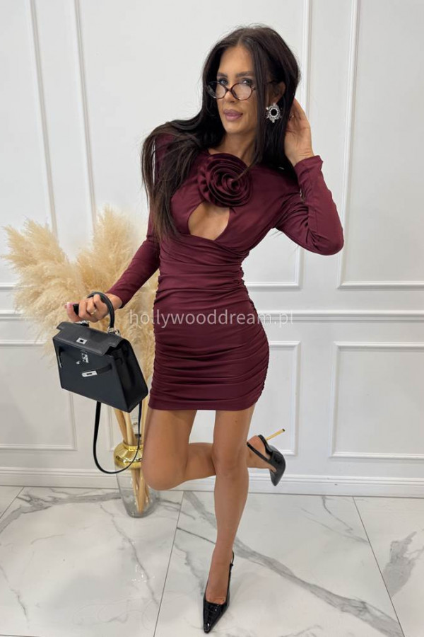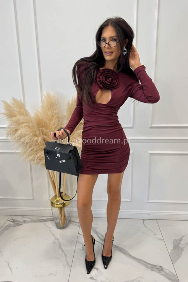 Sukienka mini z marszczeniami, różą i wycięciem przy dekolcie bordowa ROSE 161