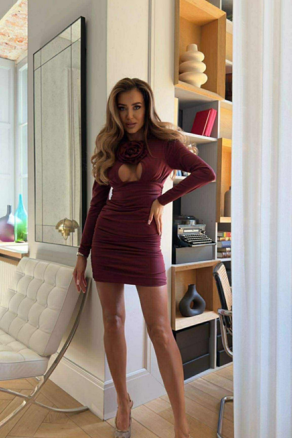 Sukienka mini z marszczeniami, różą i wycięciem przy dekolcie bordowa ROSE to esencja dziewczęcego uroku w nowoczesnym wydaniu. Uszyta z miękkiej przyjemnej w dotyku dzianiny, świetnie sprawdzi się w chłodniejsze dni, gwarantując komfort noszenia i swobodę ruchów. Jej mini długość subtelnie podkreśla nogi, a marszczenia po bokach dodają sylwetce lekkości i modelują kształty. Dopasowany krój w połączeniu z elastycznym materiałem sprawia, że sukienka świetnie układa się na ciele. Kobiece wycięcie przy dekolcie podkreśla atuty, a róża dodaje jej romantycznego charakteru. To idealna propozycja zarówno na większe imprezy, jak i romantyczne randki.