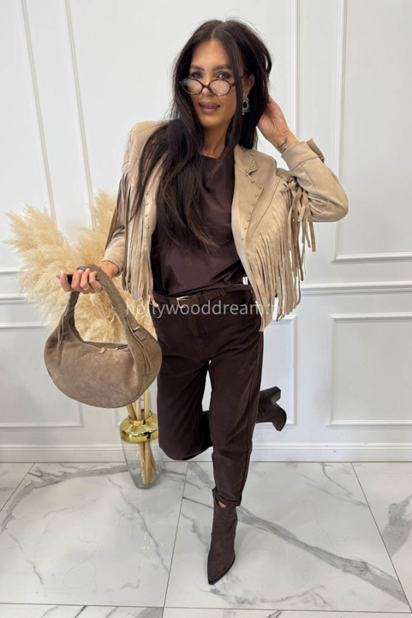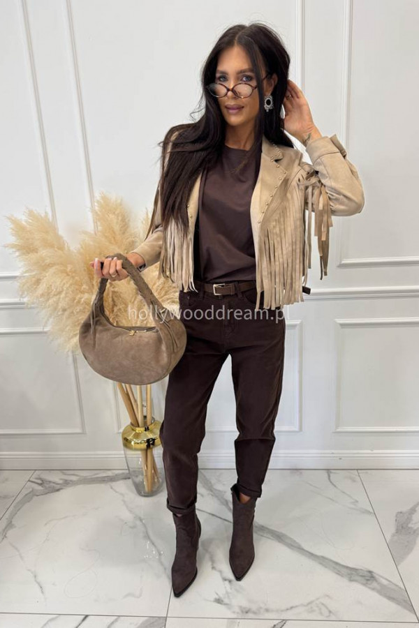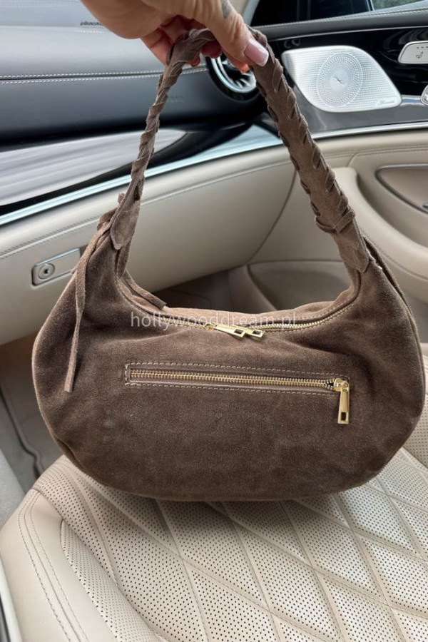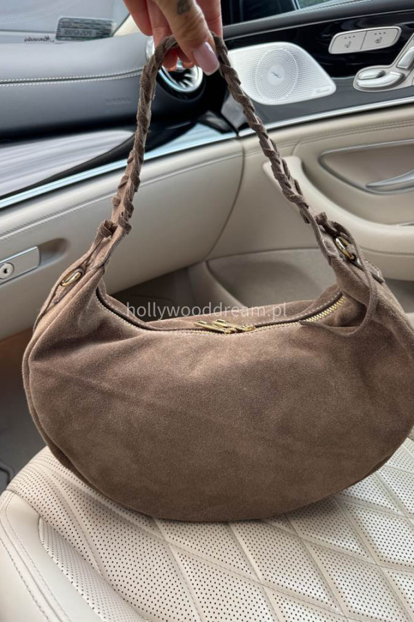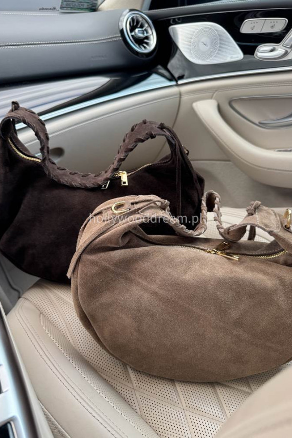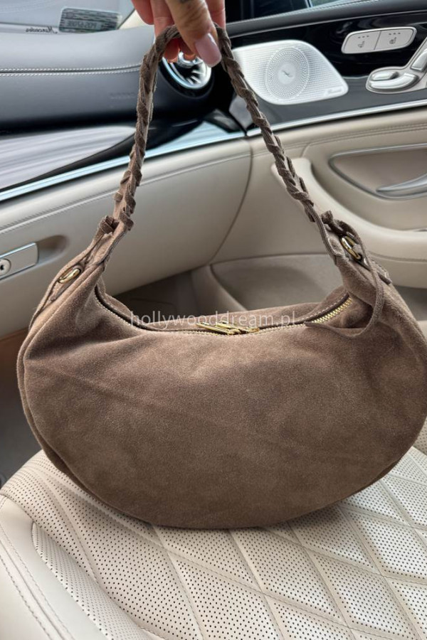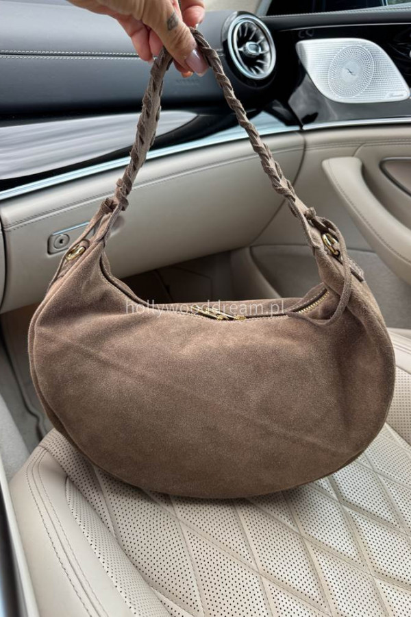 Torebka FELICJA to model w kształcie półksiężyca wykonany z wysokiej jakości włoskiej skóry naturalnej zamszowej. Elegancki i pojemny design sprawia, że doskonale sprawdzi się zarówno na co dzień, jak i w pracy. FELICJA ma dużą pojemną kieszeń oraz jedną mniejszą po boku, dodatkowo posiada długi pasek z możliwością odczepienia. Stała rączka torebki nie jest zwyczajna, ponieważ posiada sznureczek, którym jest przeplatana od zewnętrznej strony. Torebka w średnim rozmiarze.