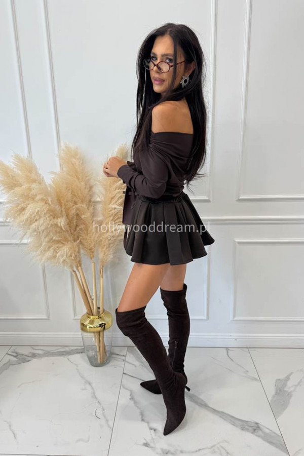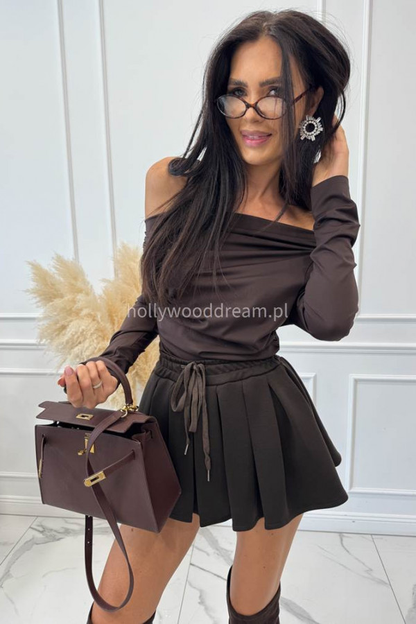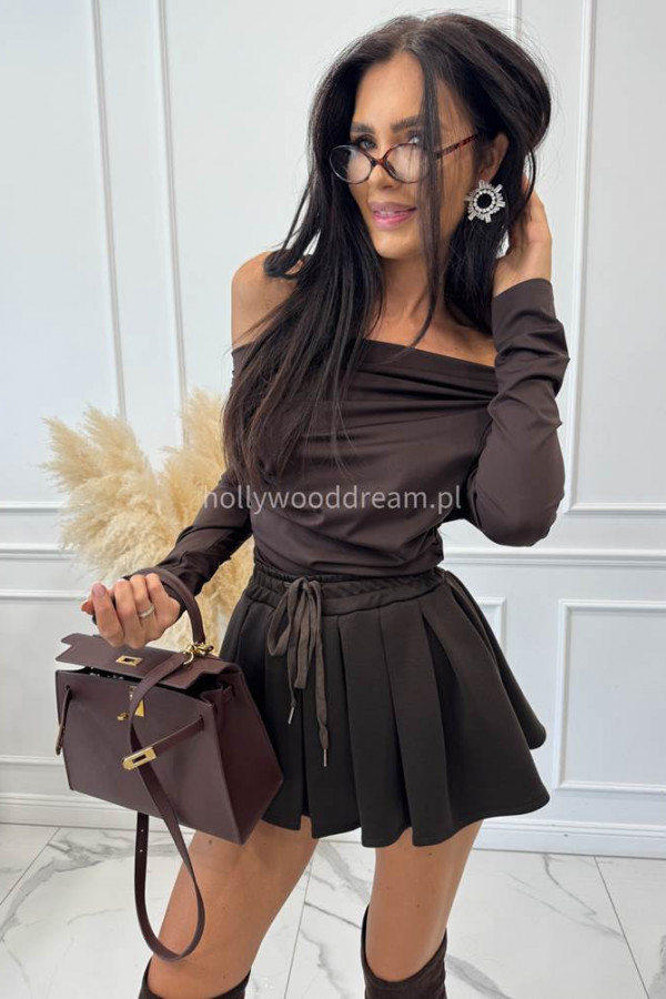 Bluzka z dekoltem w łódkę i marszczeniem na ramieniu czekoladowa JAGODA 02