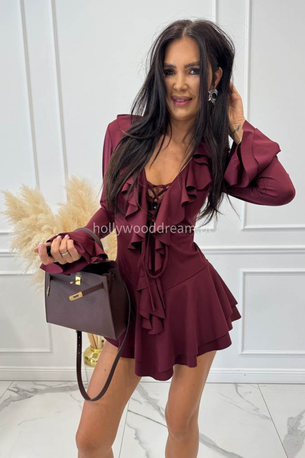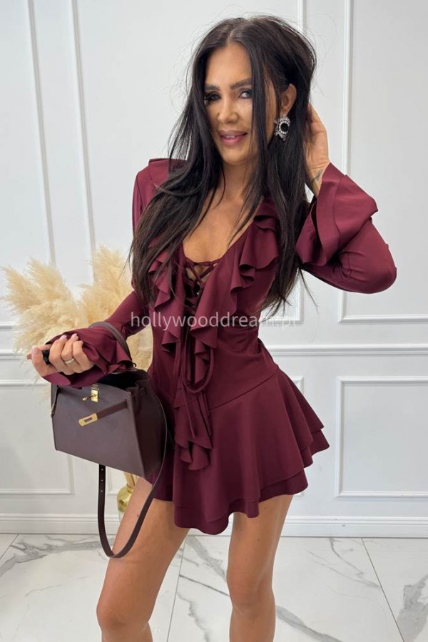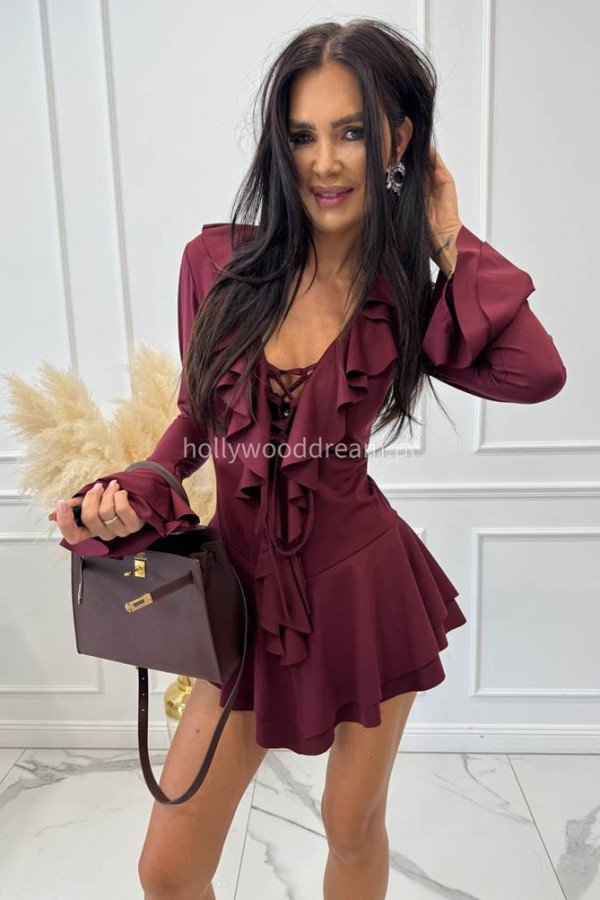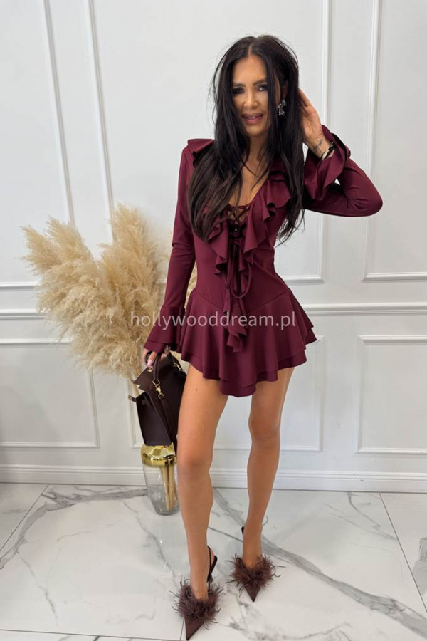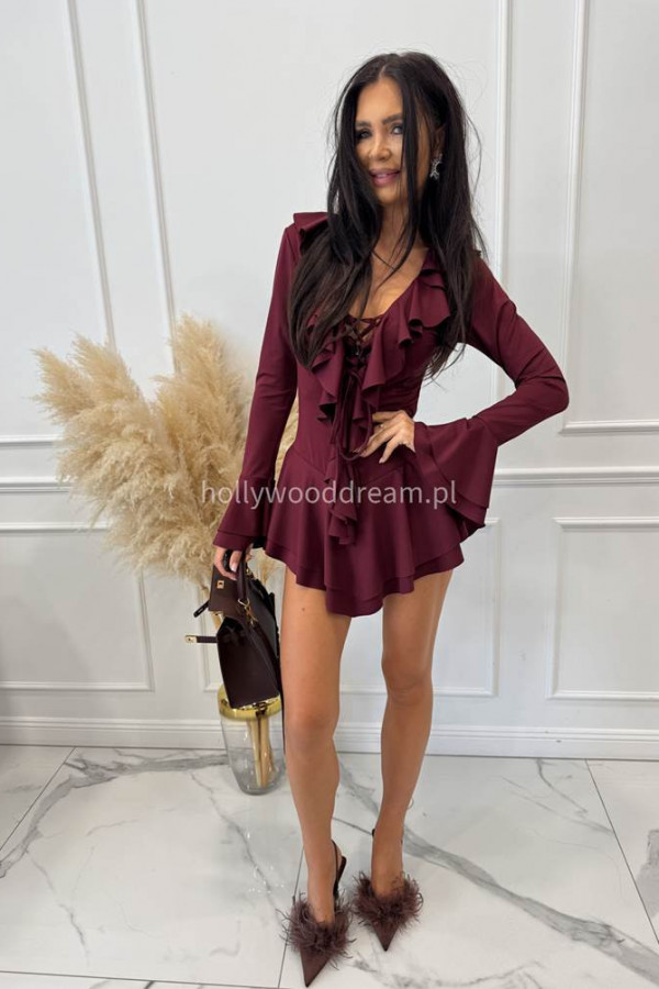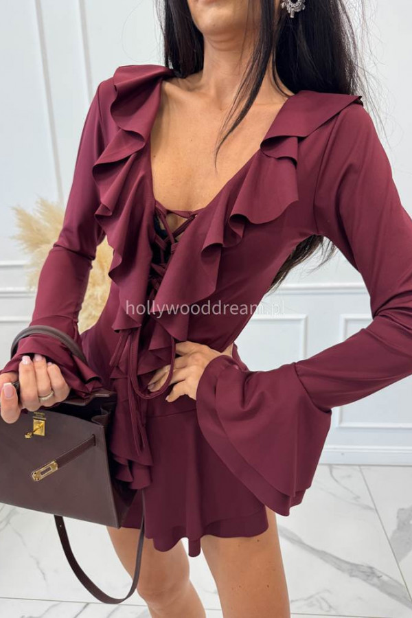 Sukienko-kombinezon z falbanami i wiązaniem bordowy ERYK 02