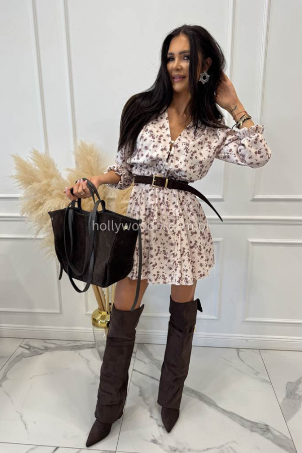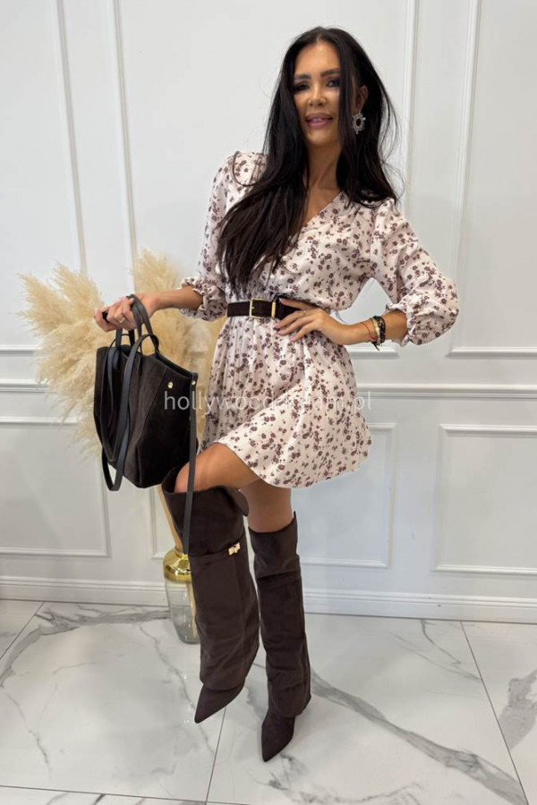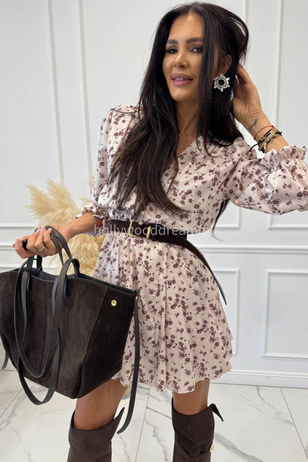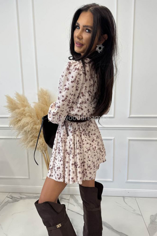 Sukienka mini na długi rękaw w brązowe kwiaty beżowa Musa 172