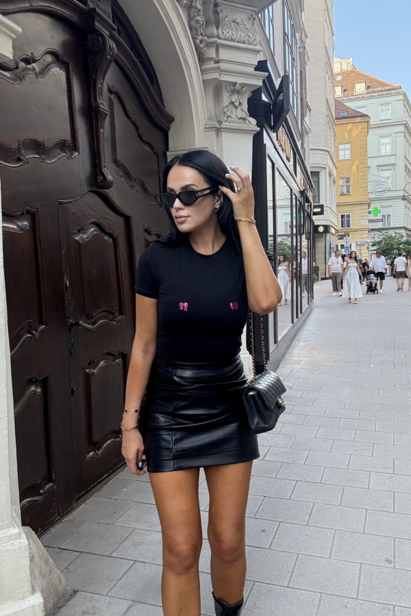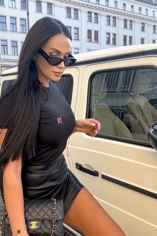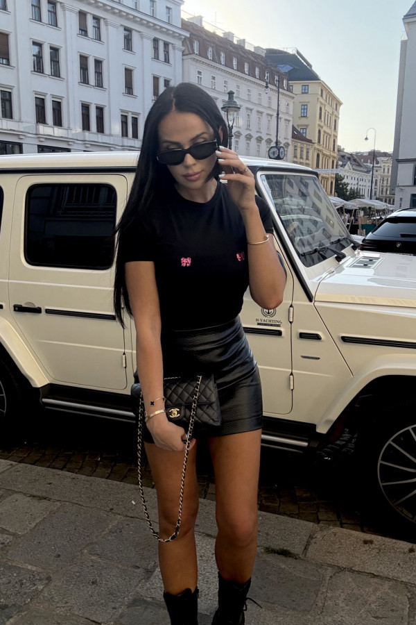 Koszulka na krótki rękaw z kokardkami czarna LOLA to idealna propozycja dla kobiet ceniących minimalizm i klasykę. Koszulka wykonana z przyjemnej wiskozy idealnie sprawdzi się w cieplejsze dni i zapewni komfort oraz wygodę przez cały dzień jej użytkowania. Delikatne aplikacje w postaci kokardek dodają jej dziewczęcości oraz słodkości. LOLA jest bardzo uniwersalna dlatego możesz ją zestawić ze wszystkim co lubisz, a zapewne będziesz zawsze wyglądać i czuć się rewelacyjnie.