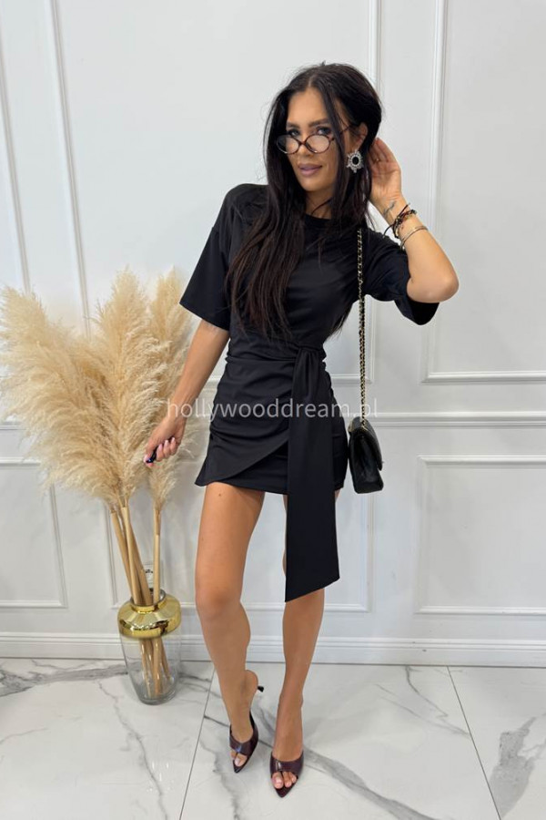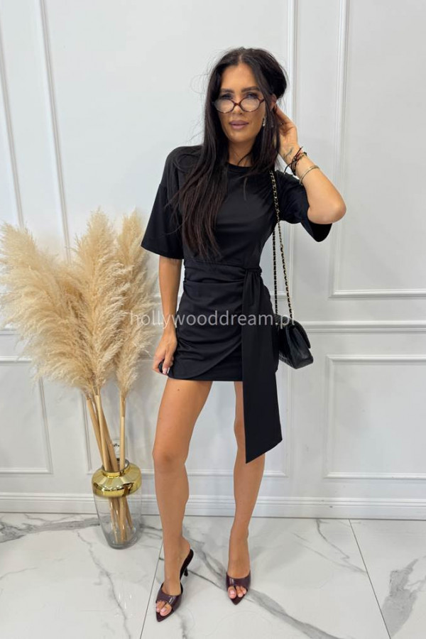 Czarna sukienka na krótki rękaw z ozdobnym pasem MELODY 17