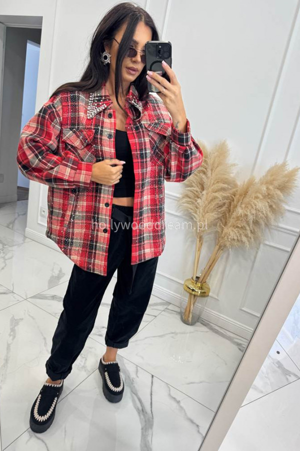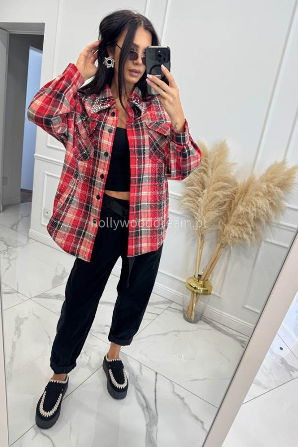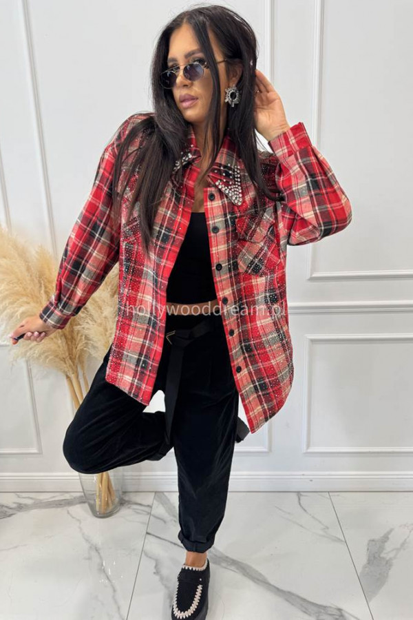 Czerwono-czarna koszula z ociepleniem w kratę z cekinami i ćwiekami HELENA 09