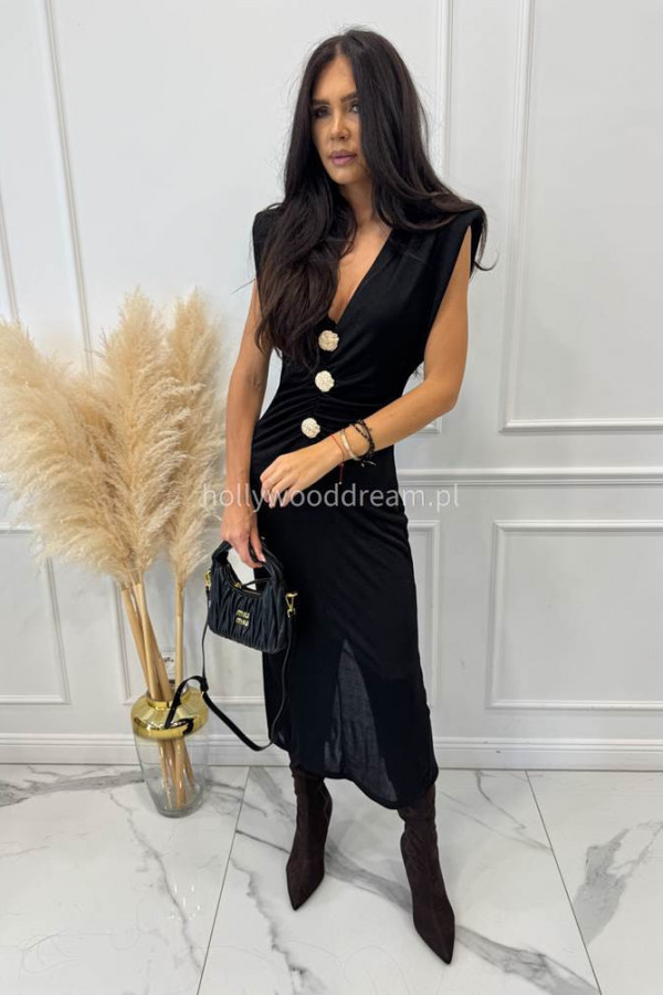 - Czarna sukienka midi z pozłacanymi ozdobami i poduszkami przy ramionach EWKA