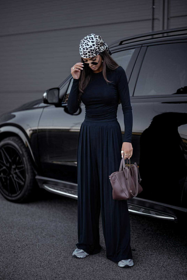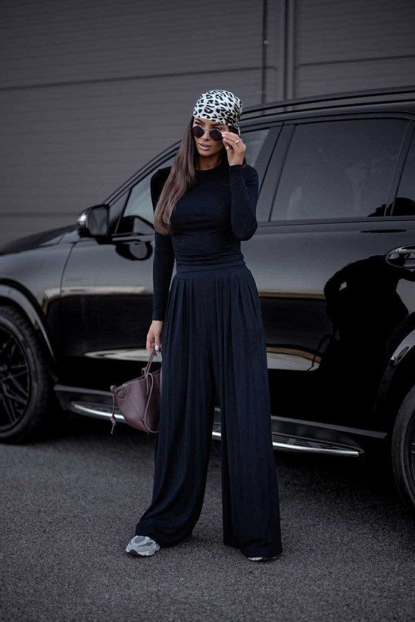 Czarny komplet 100% wiskoza bluzka z drapowaniem+lejące spodnie MAURYCY 131