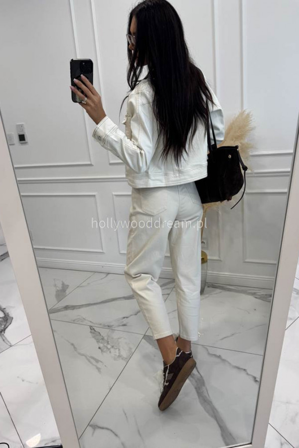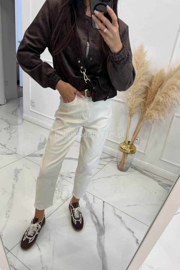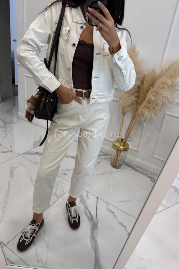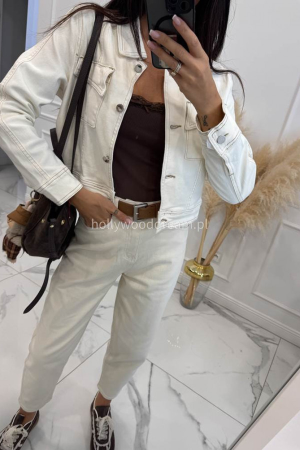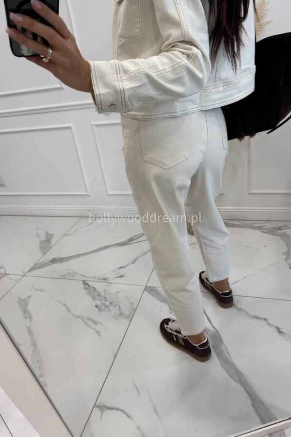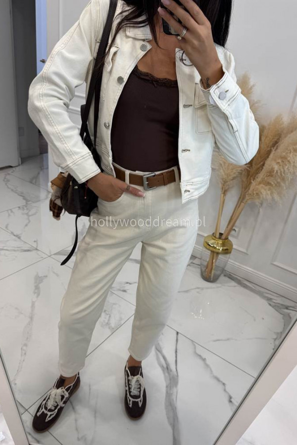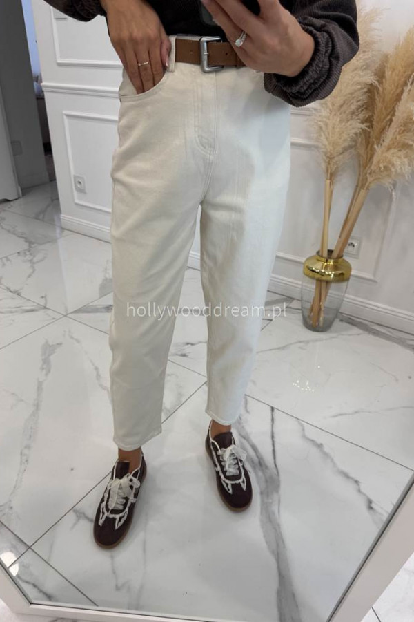 Kremowe spodnie jeans z paskiem Fobis to nowoczesna odsłona wygody i luzu. Spodnie typu balloon charakteryzują się szerszym fasonem w biodrach i delikatnym zwężeniem ku dołowi, co tworzy modny, nonszalancki look z nutą retro. Wykonane z miękkiego, oddychającego materiału w uniwersalnym kremowym odcieniu, zapewniają komfort przez cały dzień. Elastyczny pas i praktyczne kieszenie sprawiają, że spodnie są idealnym wyborem zarówno na co dzień, jak i w stylizacjach smart casual. Doskonale prezentują się z dopasowaną górą, oversize'ową koszulą czy basicowym t-shirtem.