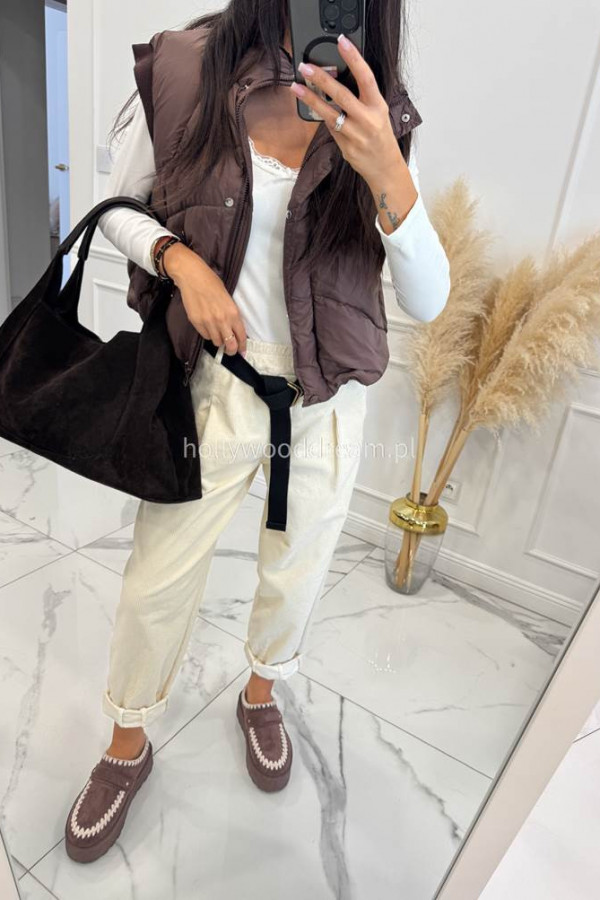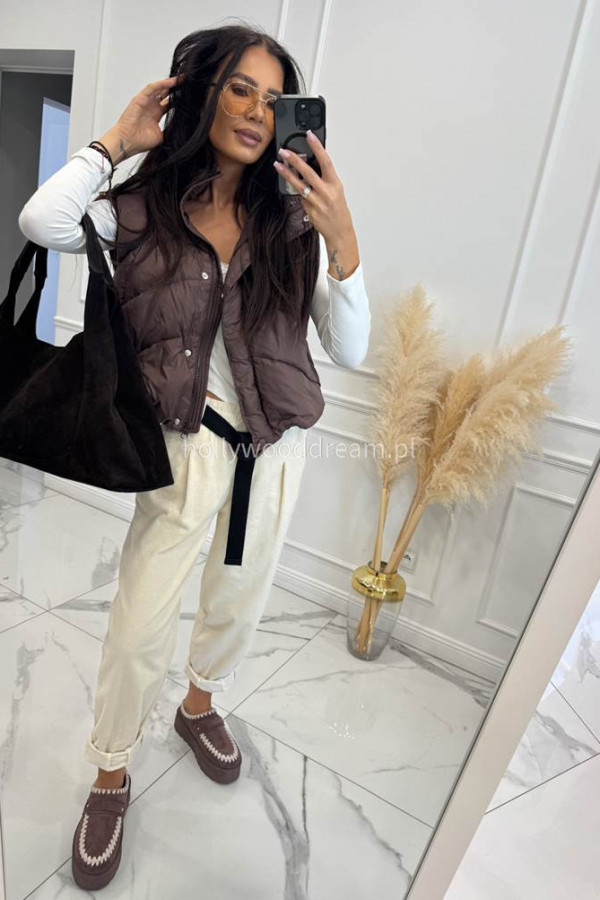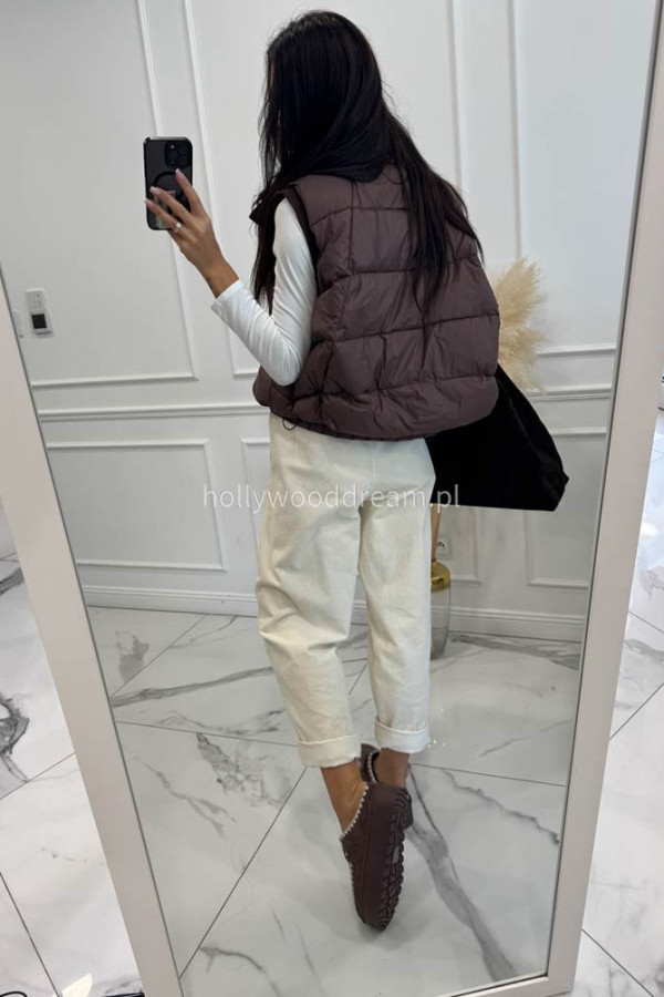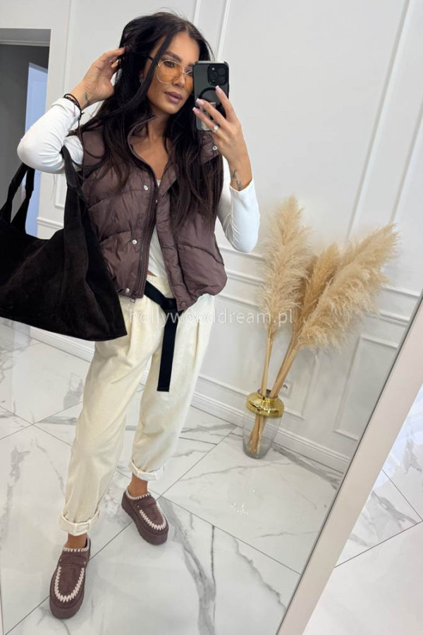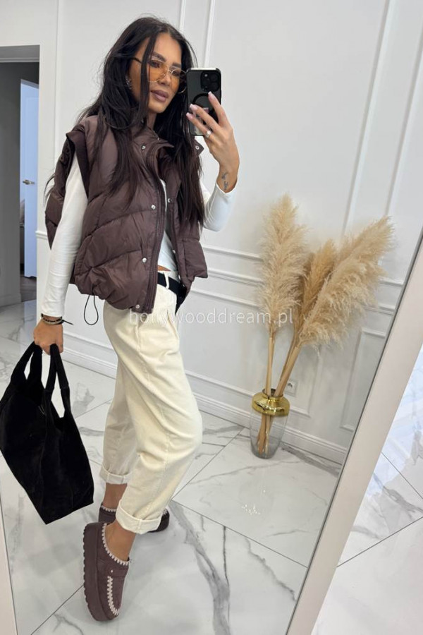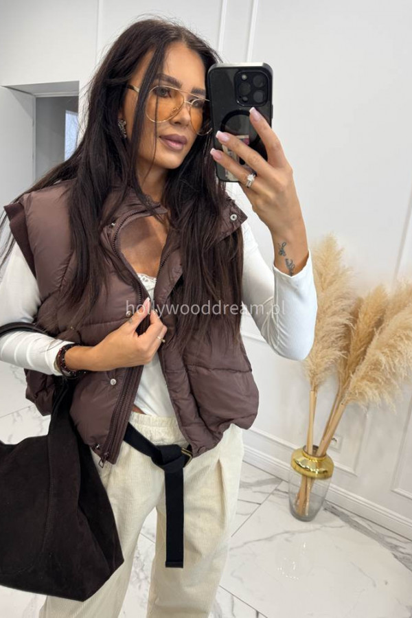 - Czekoladowa kamizelka puchowa krótka ze ściągaczami PAOLA